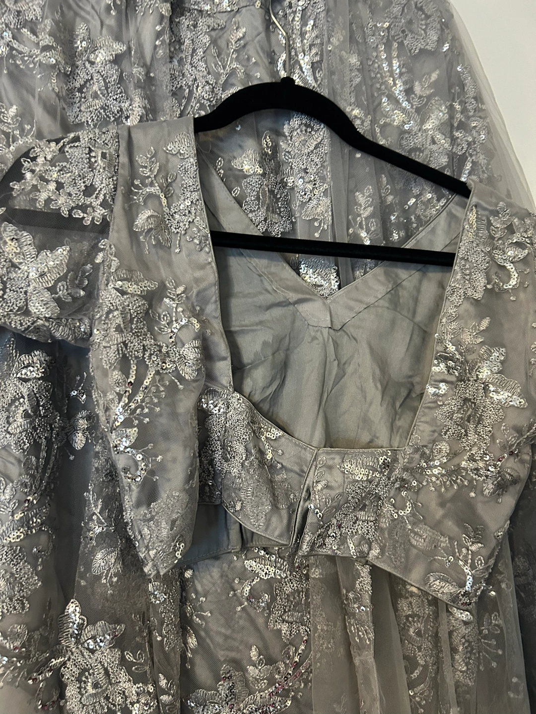 Beautiful grey lehenga set with matching dupatta. Includes a top, skirt, and dupatta. Perfect for any special occasion!