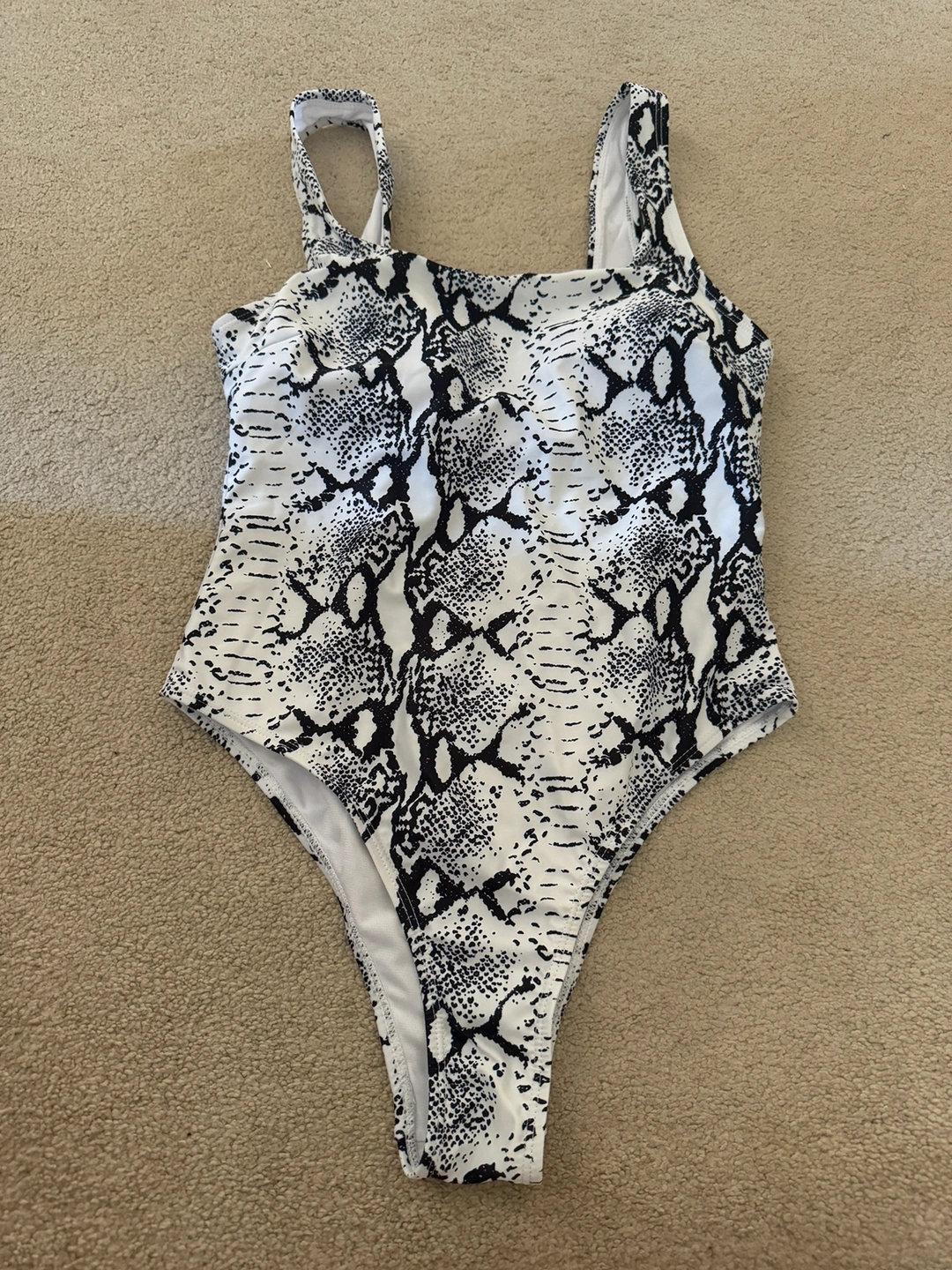 A one-piece swimsuit with a snake print. It has a scoop neckline and thin straps. It is a high-cut leg style. The swimsuit is a black and white print.