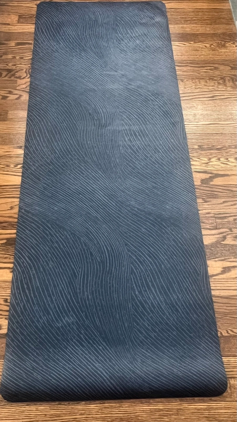 Blue yoga mat with a wave design.