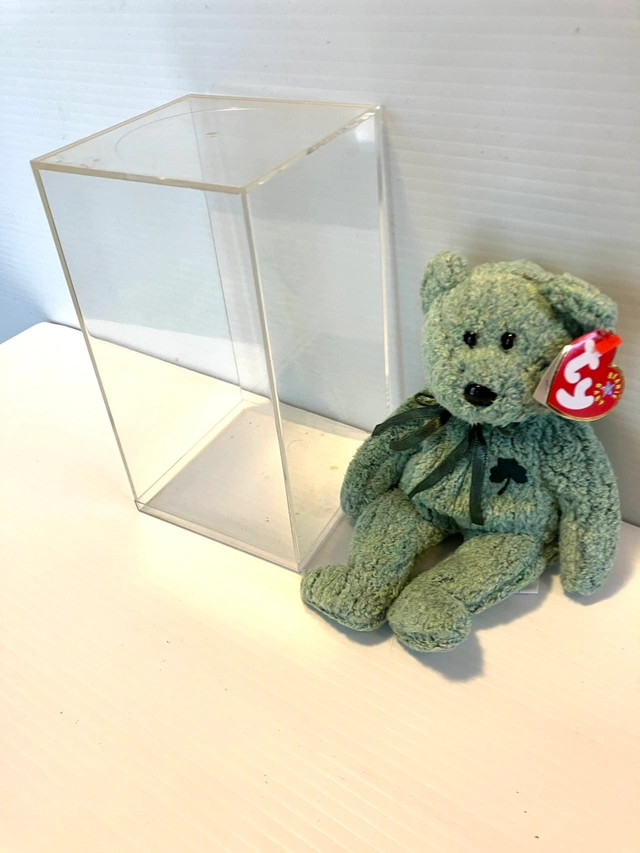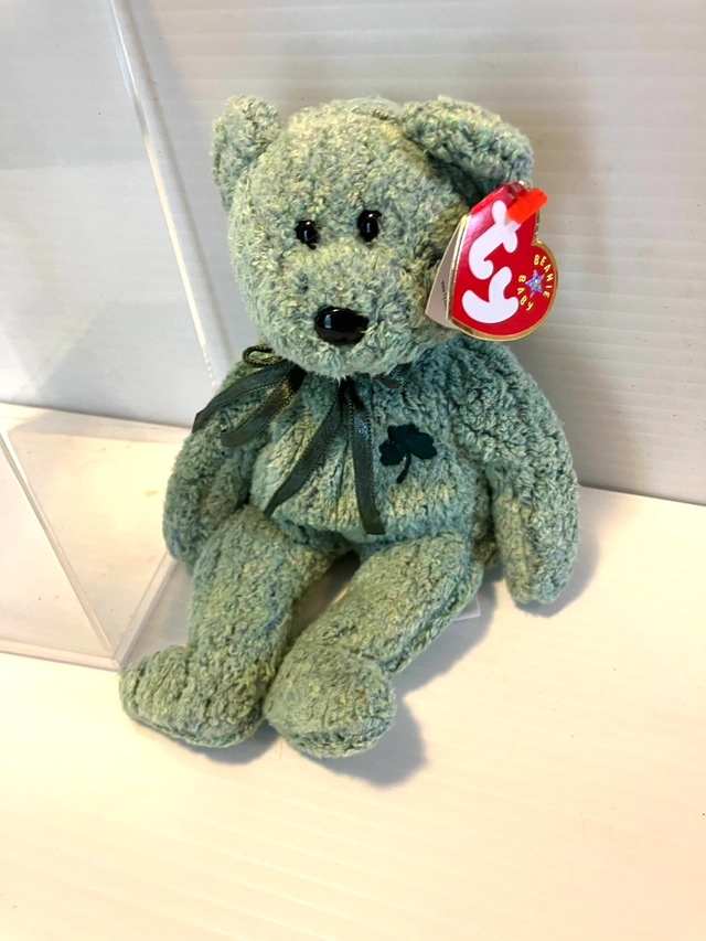 Vintage saint Patrick’s day Beanie Baby with a green shamrock on its chest and a green ribbon around its neck.