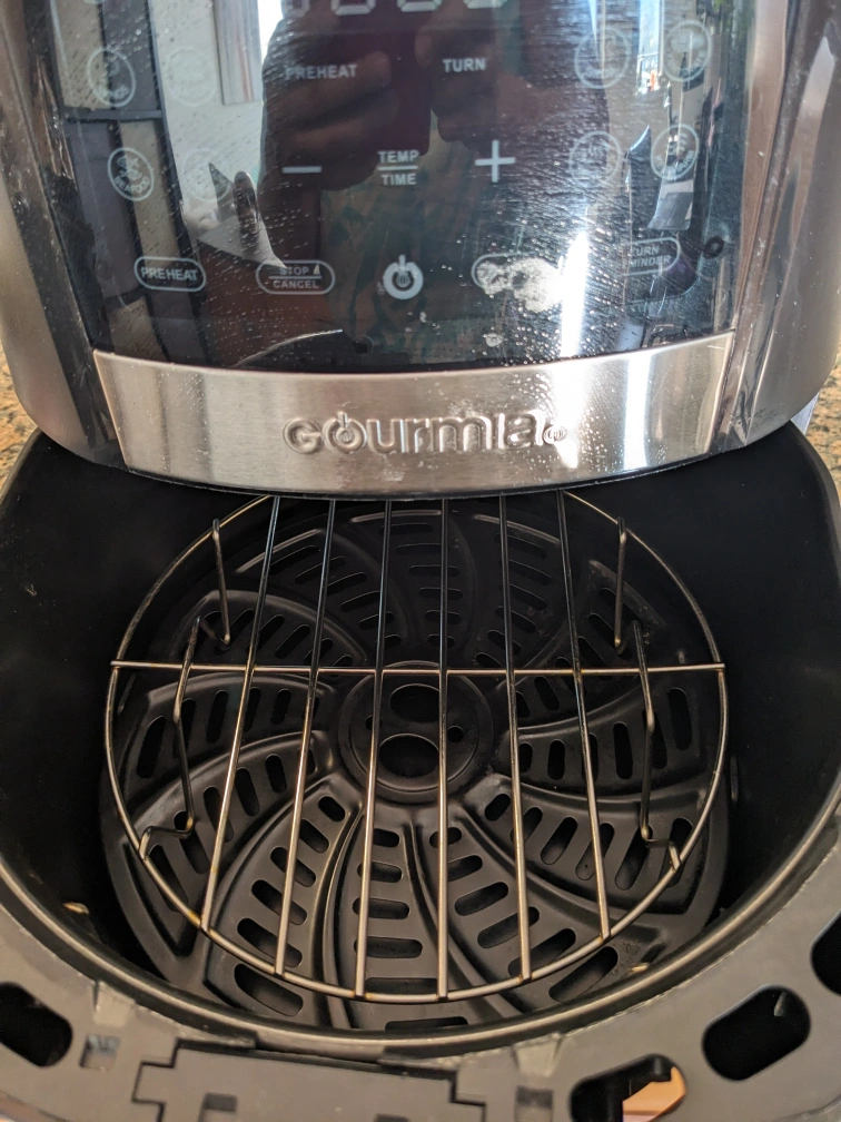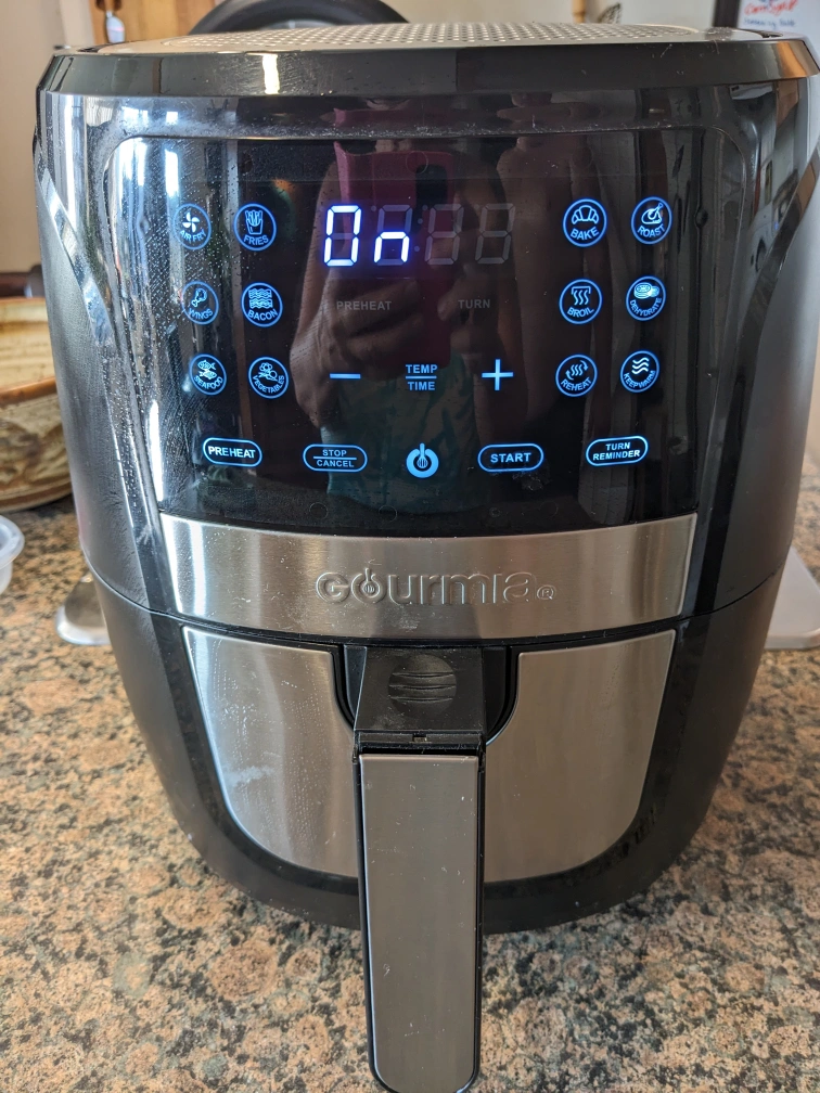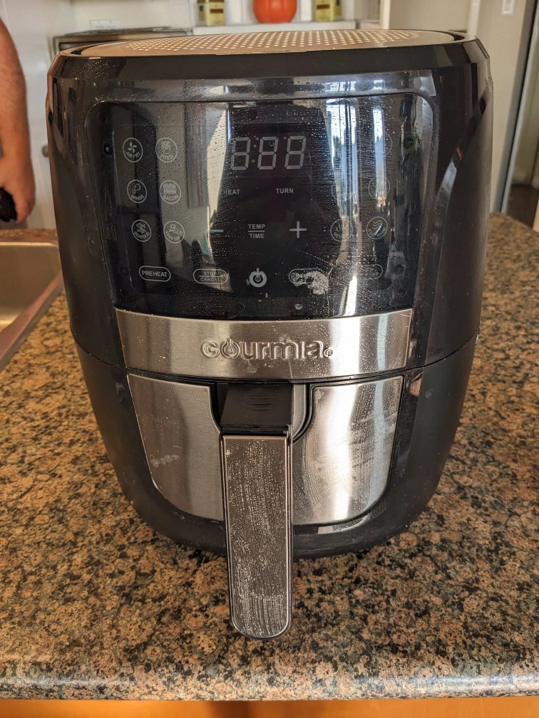 Digital air fryer with multiple functions and includes a wire rack. Used twice and worked really well, but. then we just kinda forgot about it in the pantry.