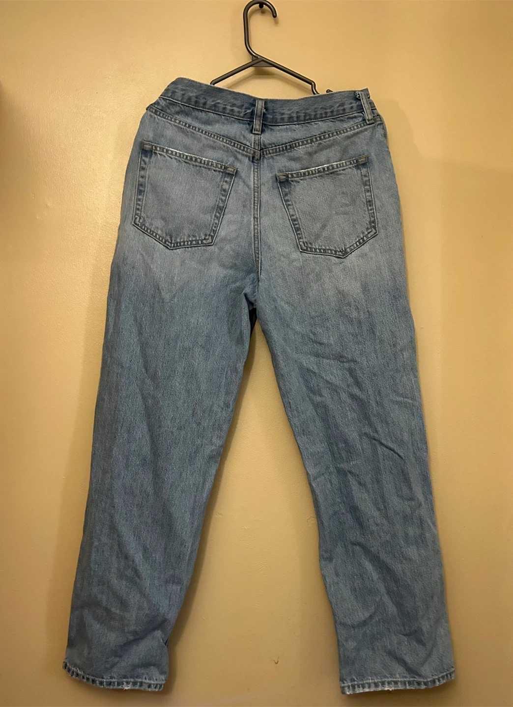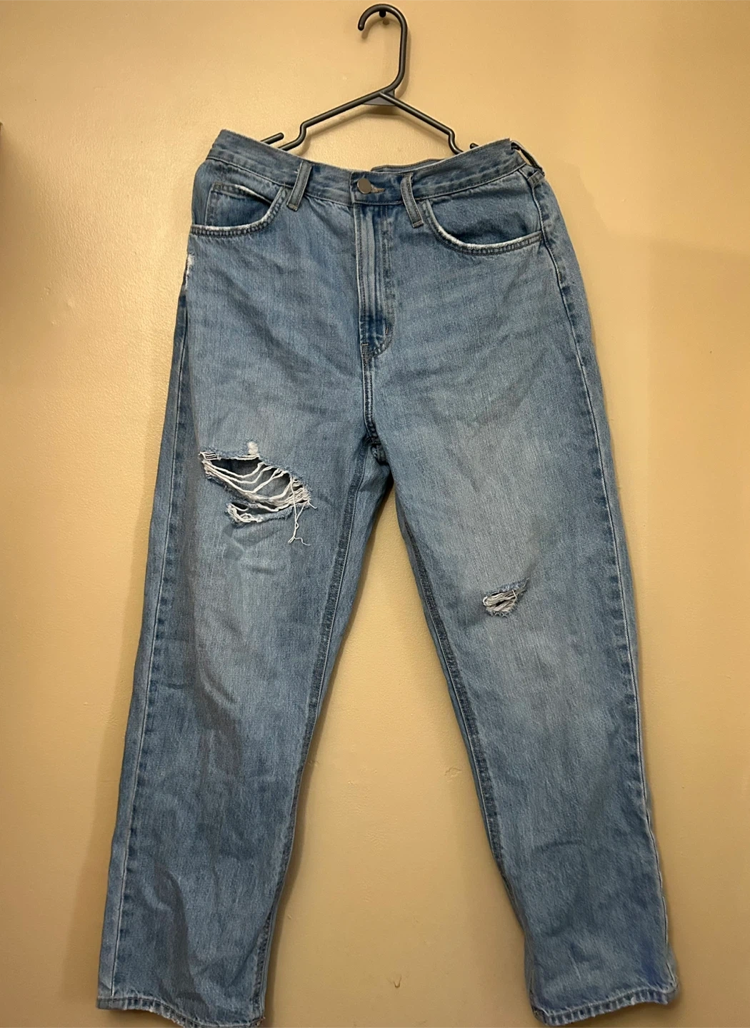Hi! I'm selling a pair of used Oak + Fort jeans that feature a stylish, distressed design with rips at the knees and on the thigh, these jeans offer a fashionable, worn-in look. They are a light wash, high-waisted, cropped style, perfect for casual wear.
