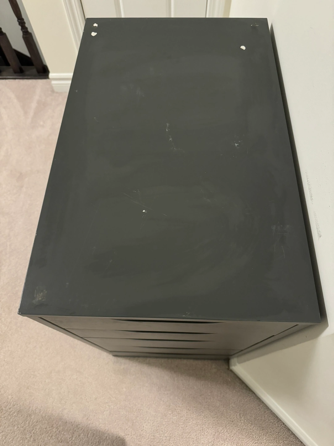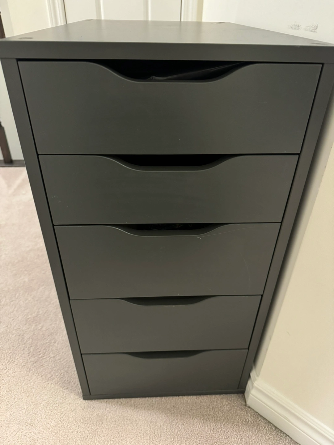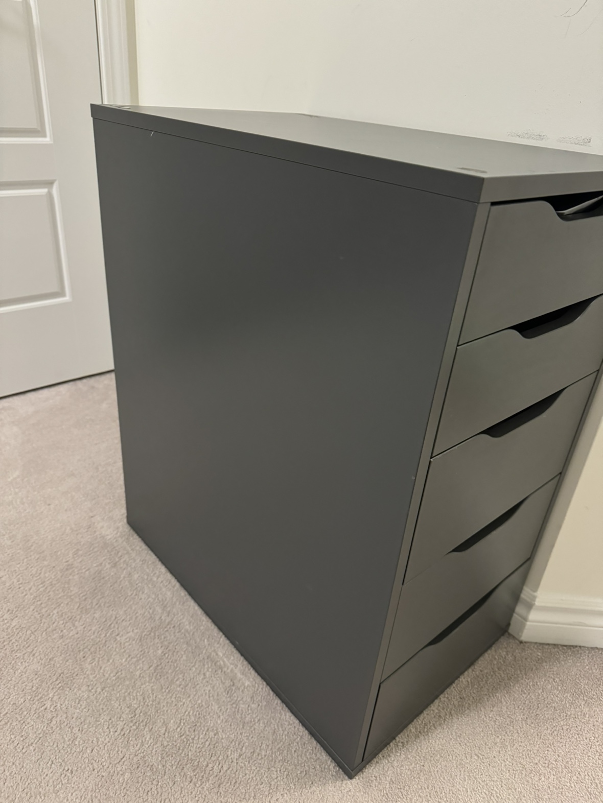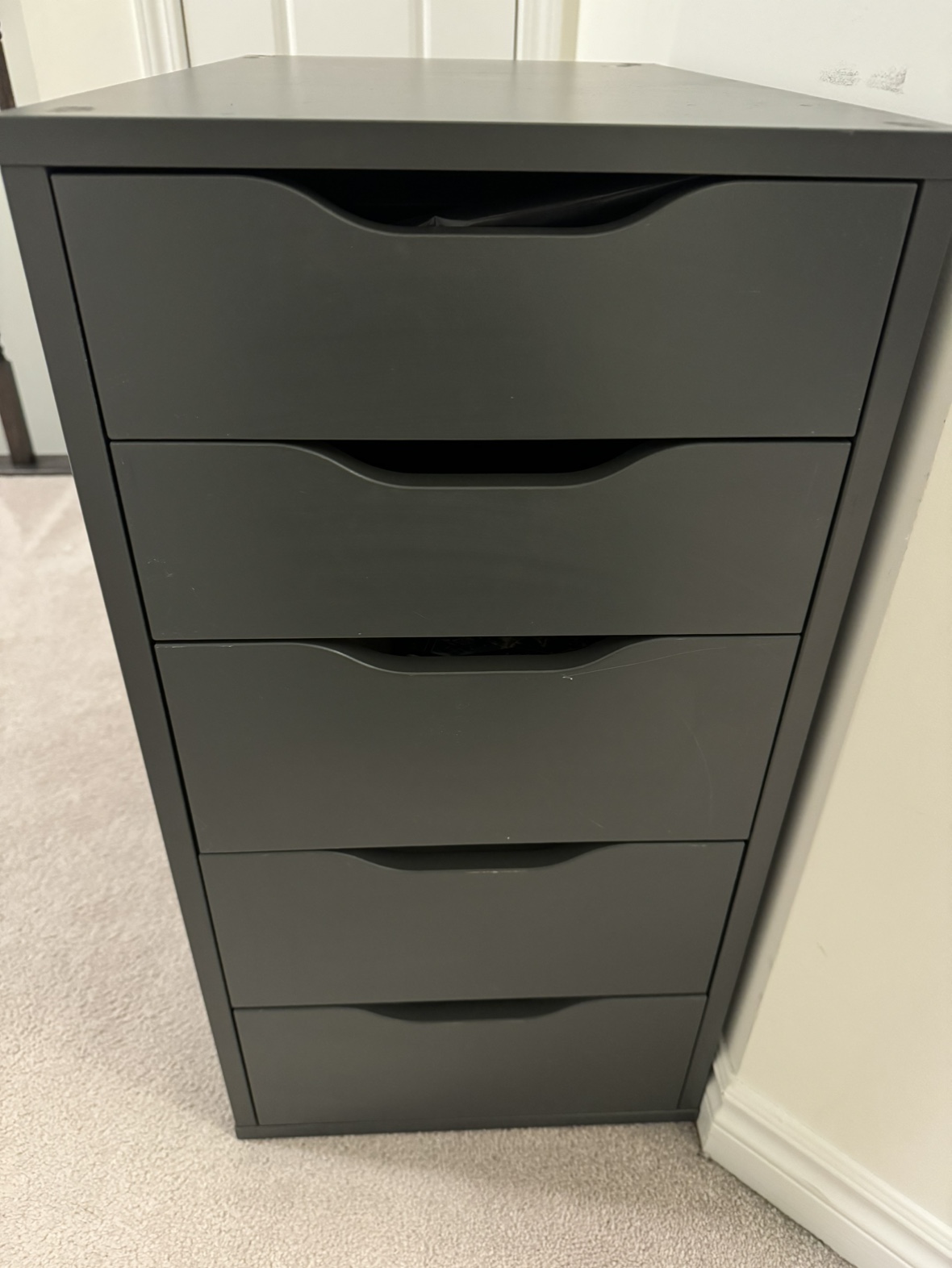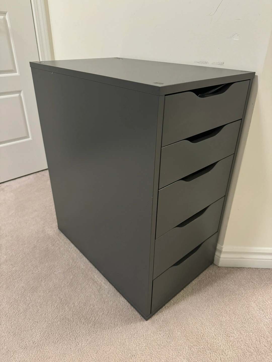 A grey cabinet with 5 drawers. In good condition. Some marks on top as was used with a desktop.