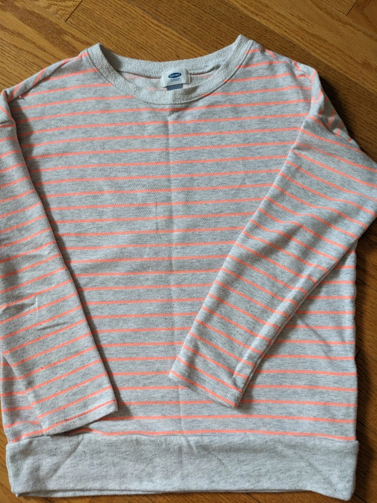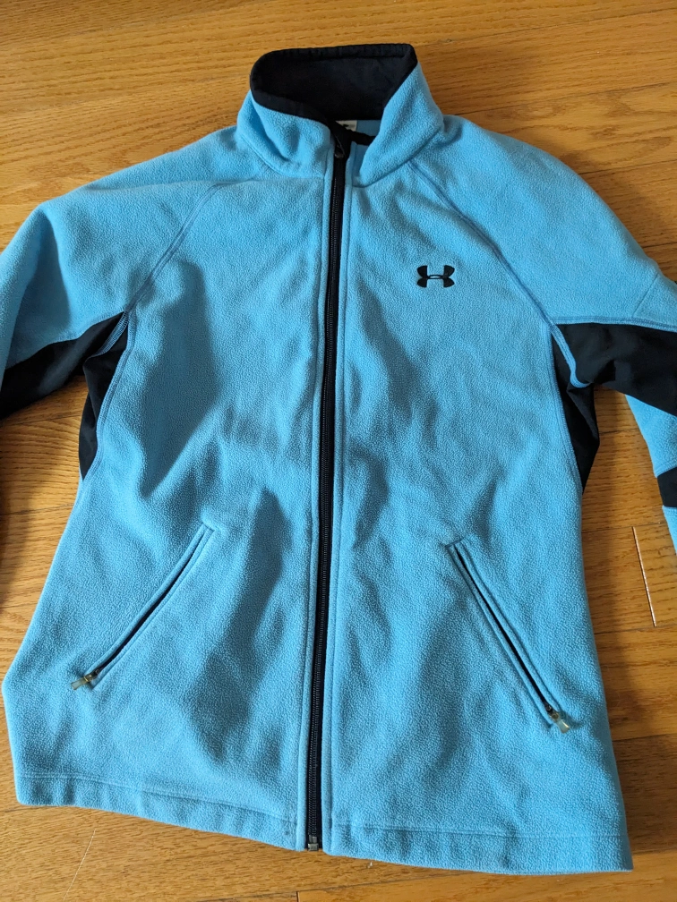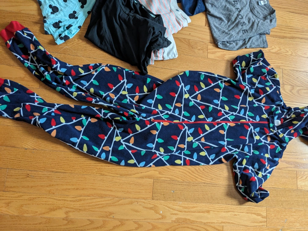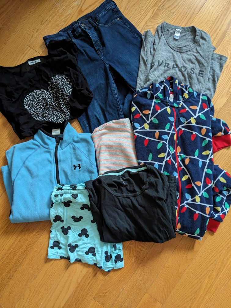 1000+Bundle of clothes includes a blue Under Armour jacket, Striped Old Navy sweater, jeans, 2 t-shirts, fleece onesie pajamas, pajama shorts and Garage sleeveless blouse with a heart.The price is for the whole bundle of the 8 items