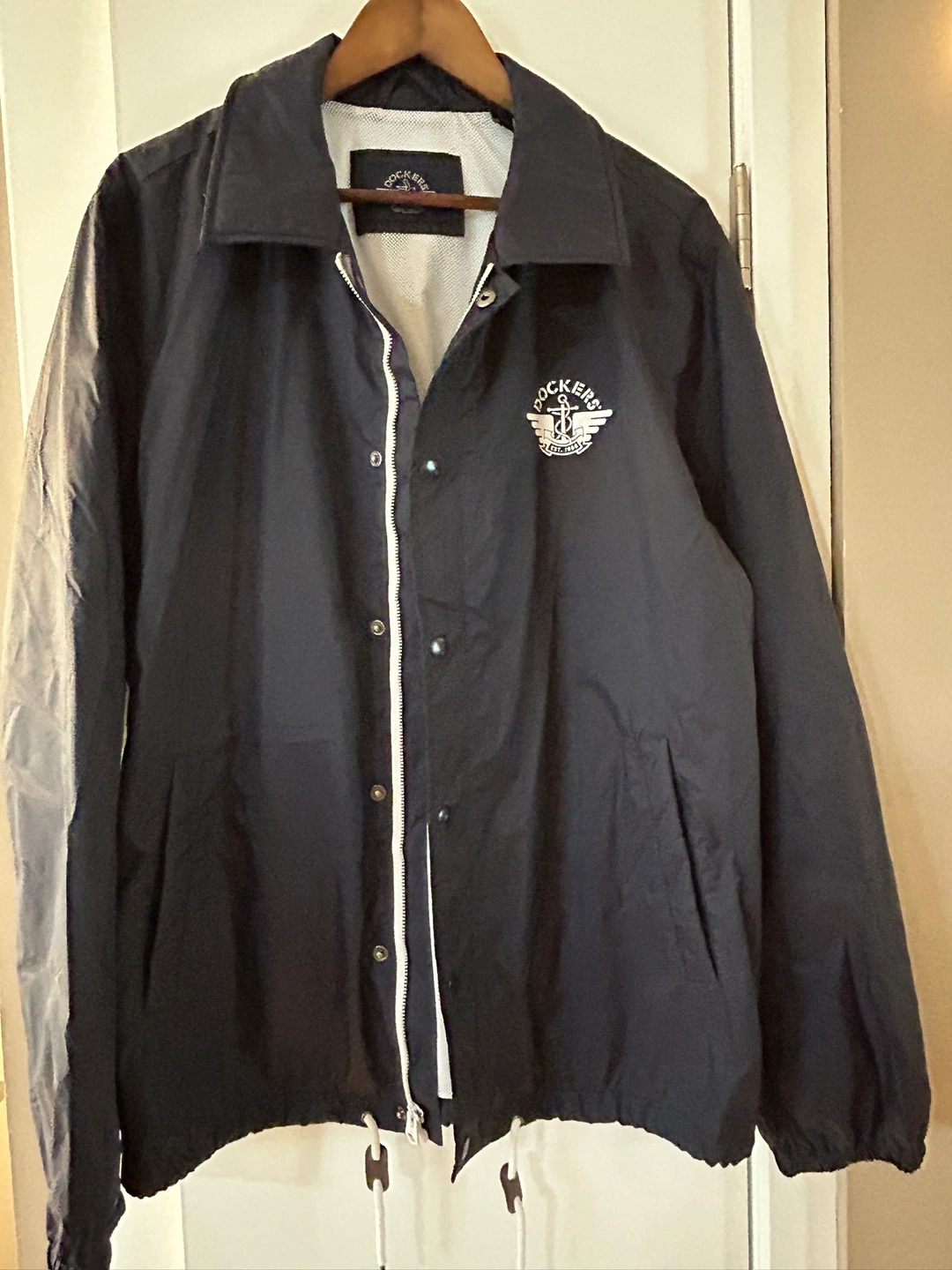 Navy Blue lightweight jacket with white zipper and buttons. The jacket features a white mesh lining and a zippered pocket on the inside.