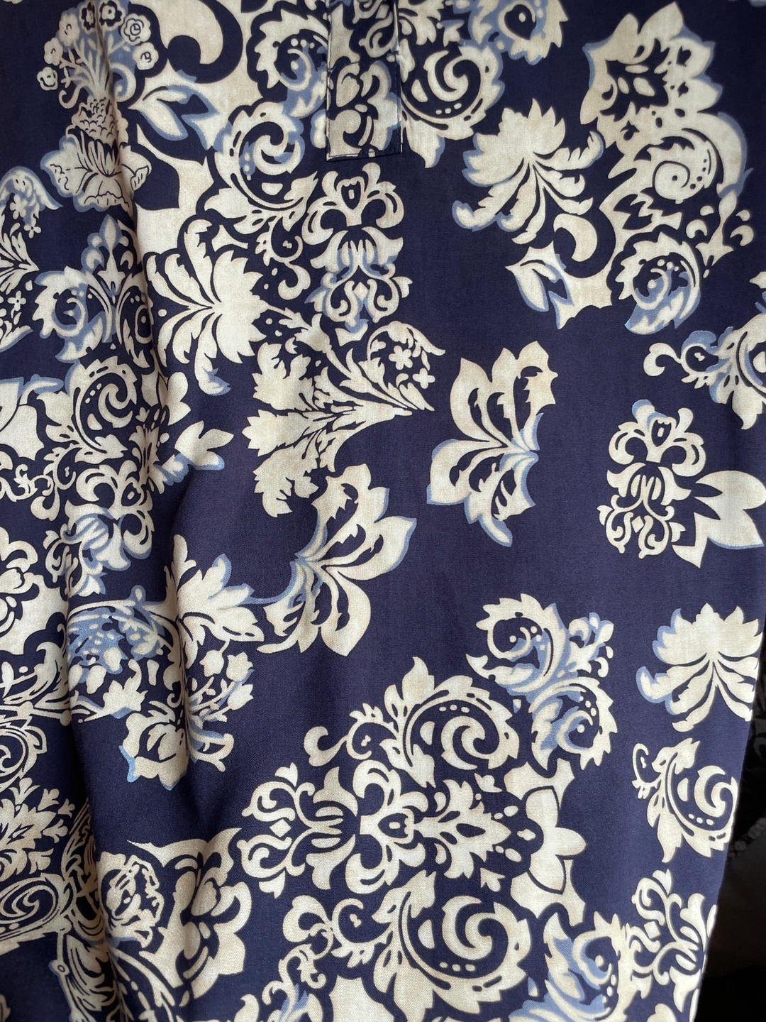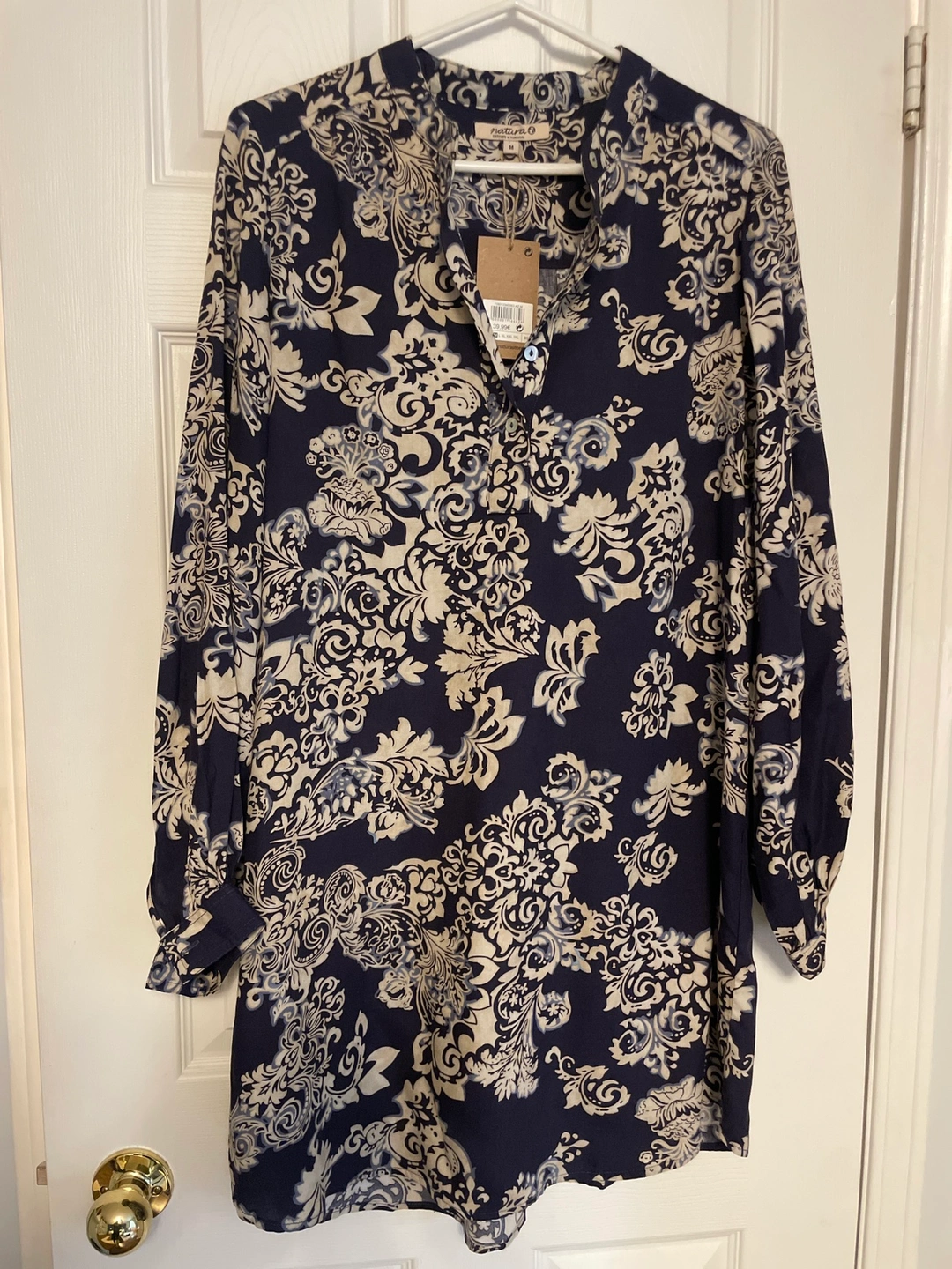 A navy and cream long-sleeved shirt dress with a button-up front. It has a mandarin collar and a relaxed fit. made of a lightweight material and can be worn as a long top or a dress . Perfect for fall.