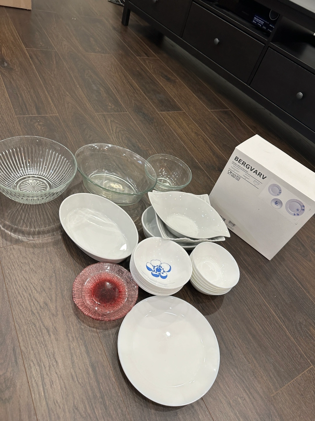 This set includes various bowls, plates, and saucers. Some are clear glass and some are white with blue floral patterns.