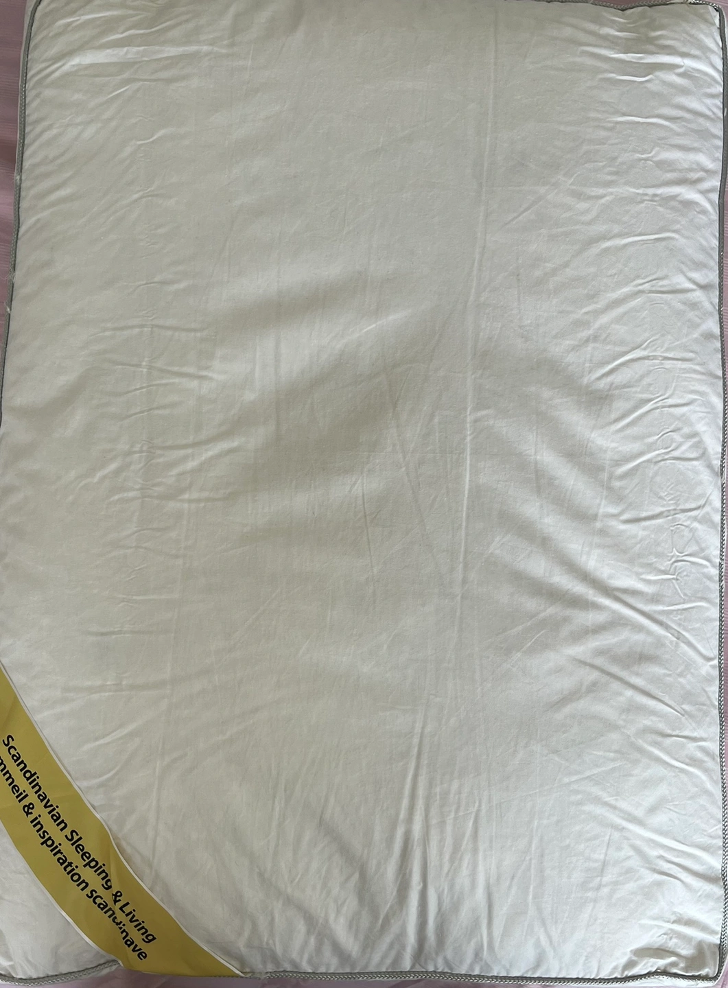 A standard sized pillow with a grey trim. The pillow is made of white fabric and has a yellow tag on one corner. The tag says "Scandinavian Sleeping & Living - smell & inspiration scandinavian". It was filled with feathers.