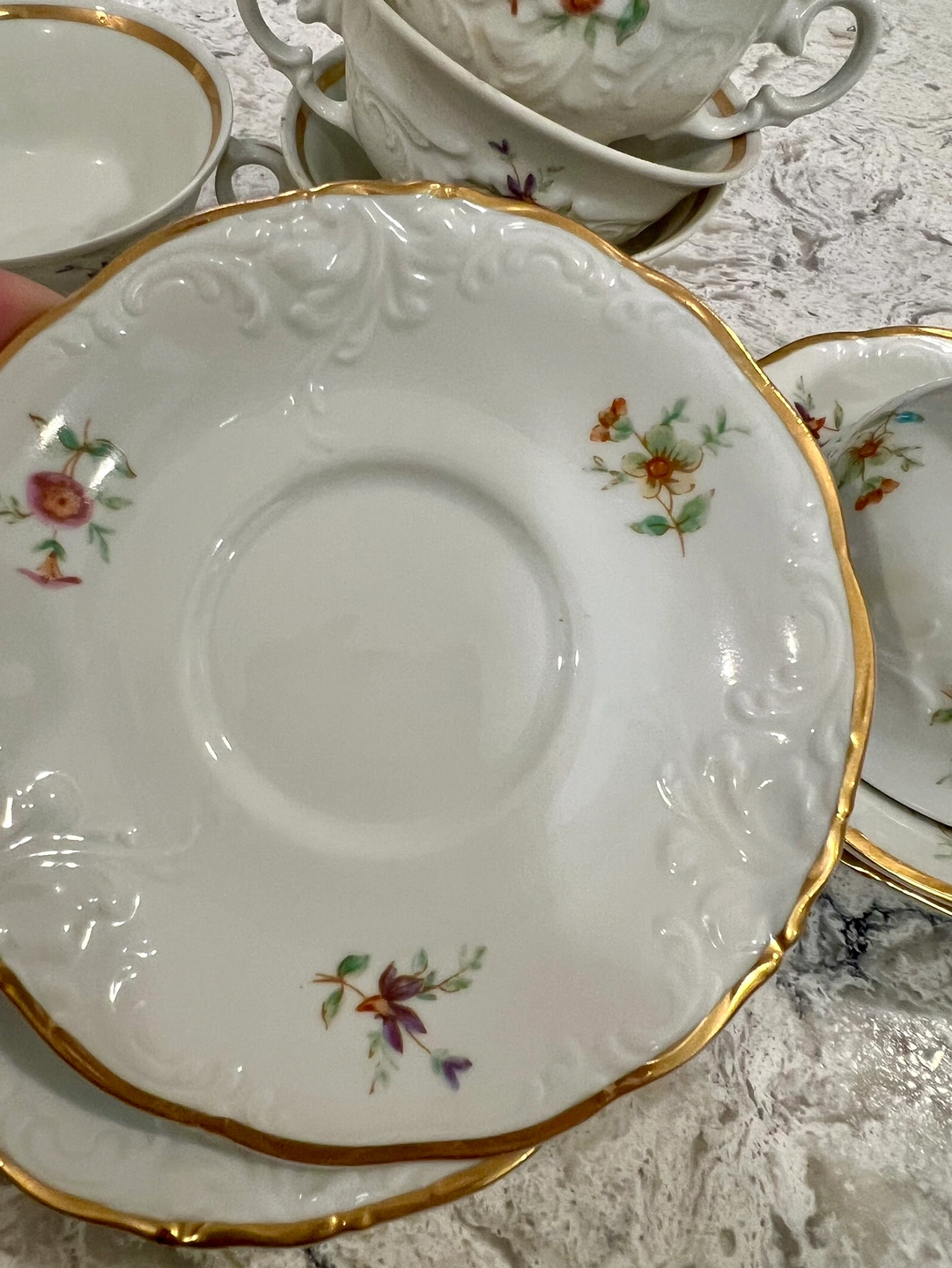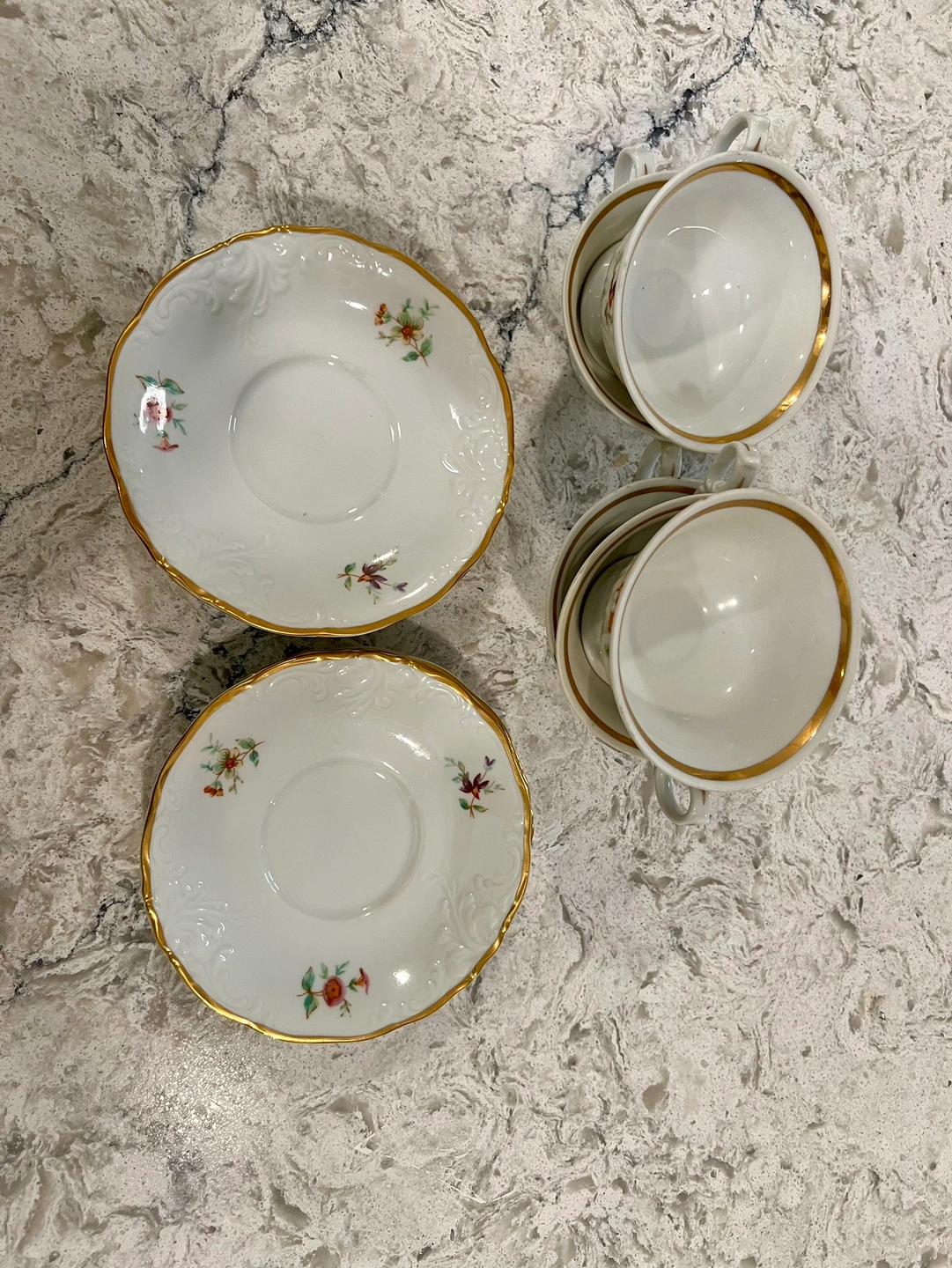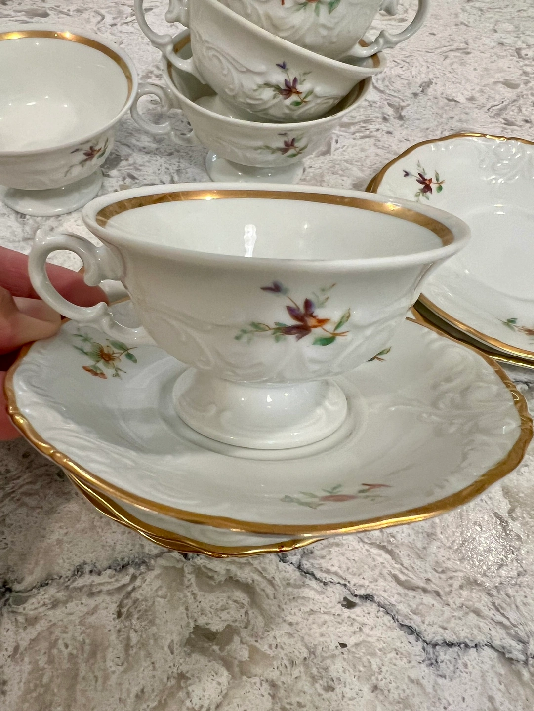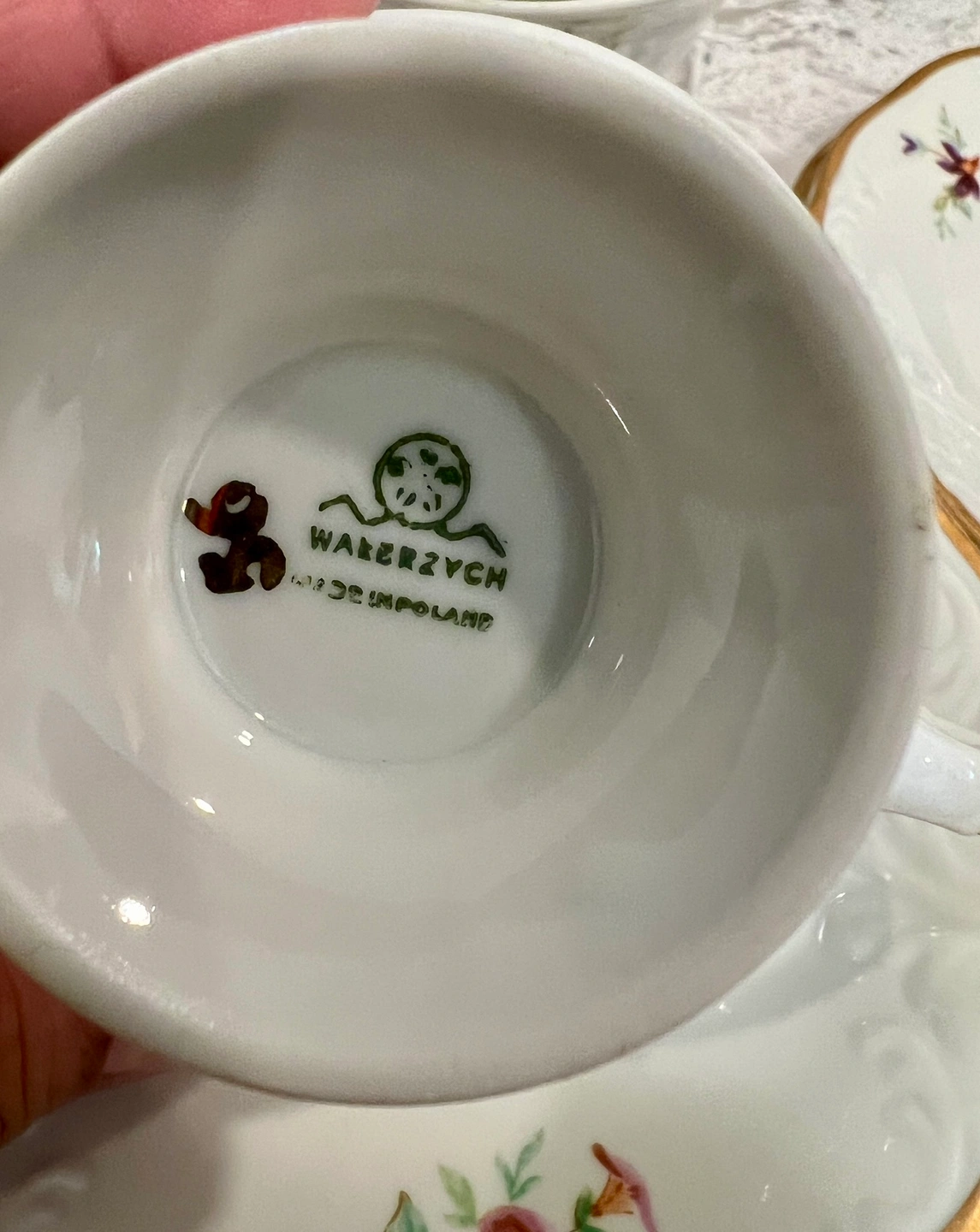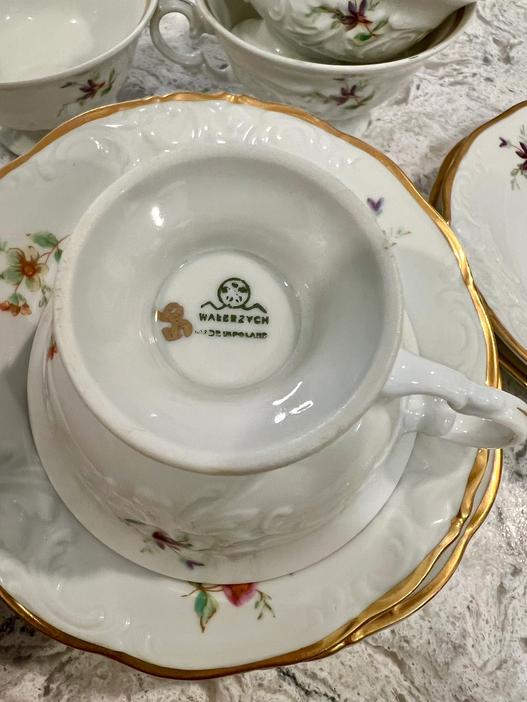 15Set of 6 teacups and saucers with floral design and gold trim. Brand is Walbrzych. Made in Poland $ 9.5 each and I have 5 If you buy 5 = 45