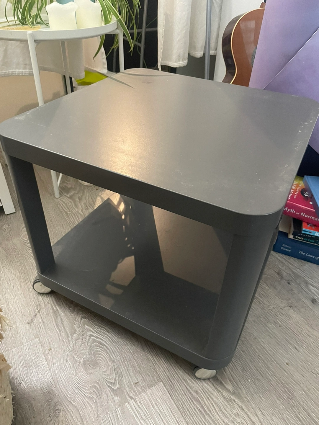 Measurement: Side table on casters, gray, 50x50 cm (19 5/8x19 5/8 ") Description: By day and by night, this table is easy to move around as your needs change. A great choice for spaces that serve several purposes such as combined living/sleeping areas or guest/working areas More info: https://www.ikea.com/ca/en/p/tingby-side-table-on-casters-gray-00349444/