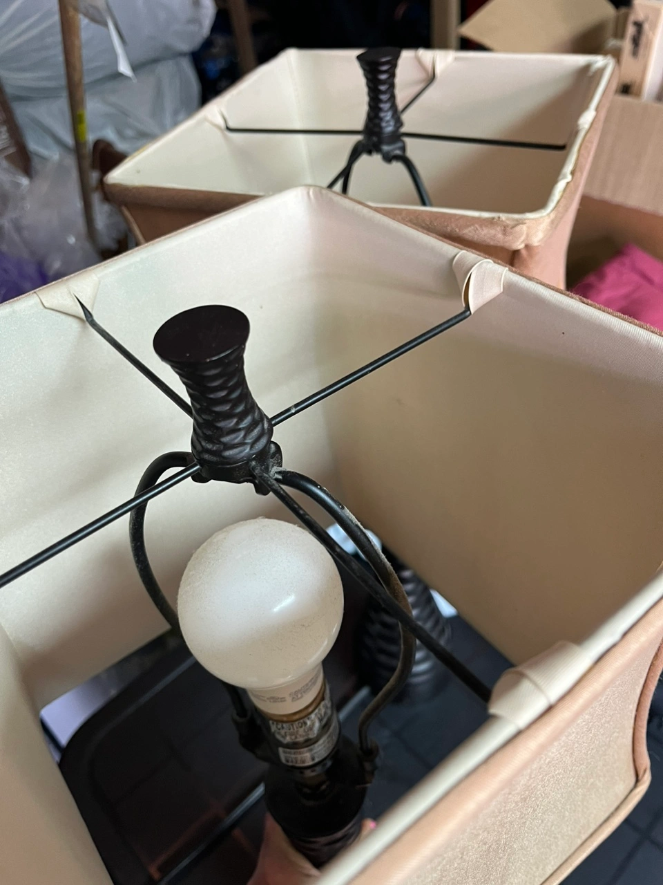Set of two table lamps with beige shades.The base is dark brown wood with a textured pattern. They stand about 23.5” tall; with the finial it is 24.5” tall. Shades are 9” square.