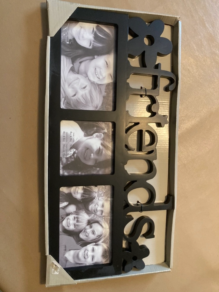 Triple picture frame with the word "Friends" on one side and "Family" on the other. The frame is black and made from wood. Each frame holds a 4x6 inch photo. The frame has a stand in the back and can be hung on the wall.
