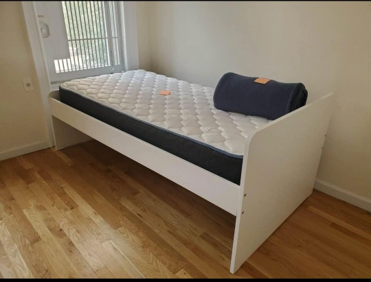 White twin bed frame with a headboard and footboard. The frame has a slat system and does not require a box spring. It is in good condition and ready for a new home.
