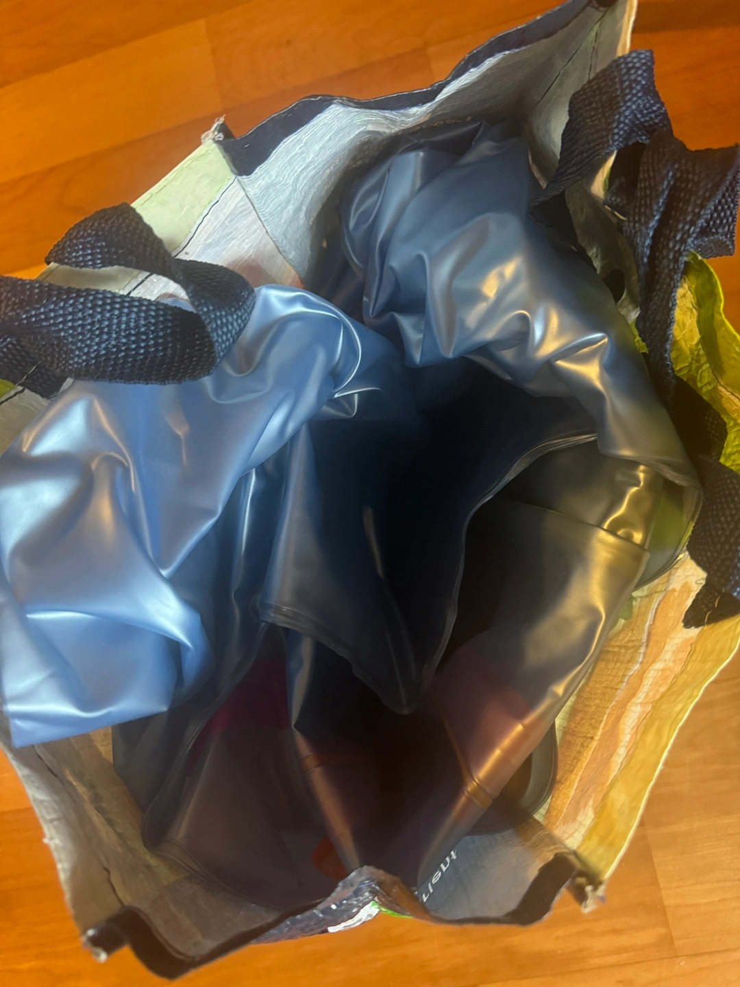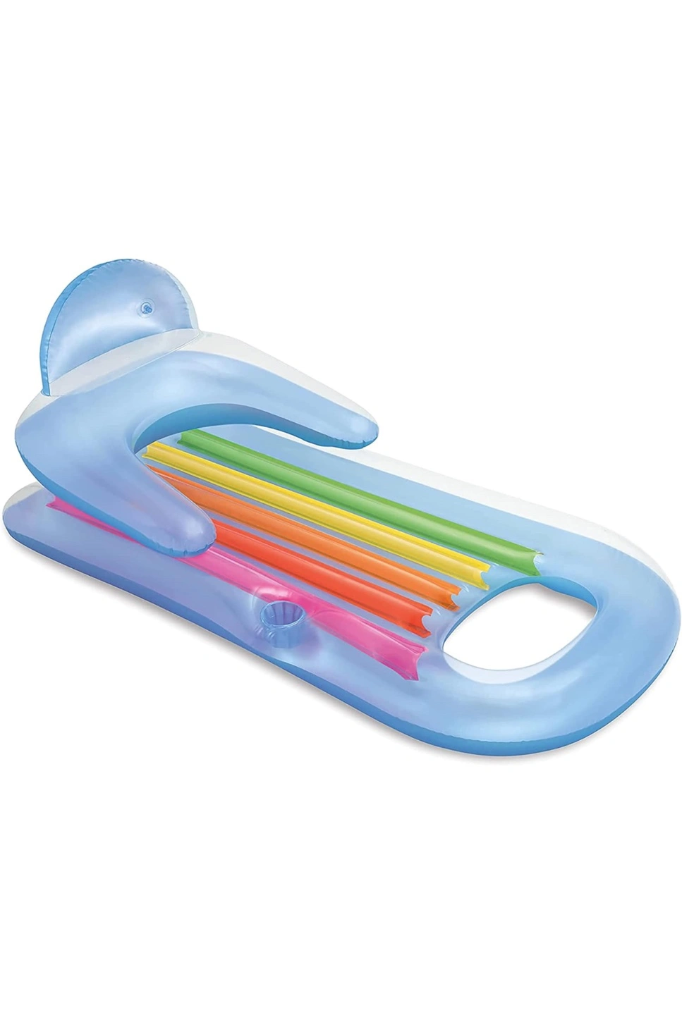 This is a rainbow coloured inflatable pool lounge chair that is perfect for relaxing in sun. Used once