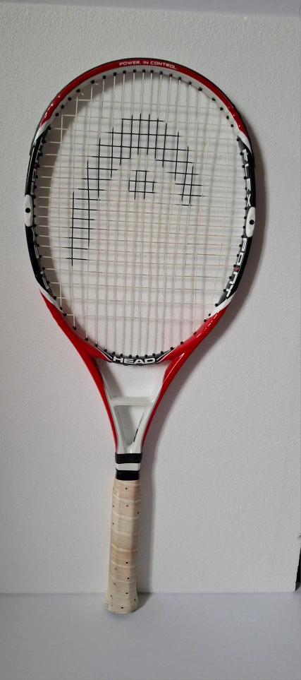 HEAD Flexpoint Fire Midplus Tennis Racquet with Case. Head Size - 102 in², Grip Size - 4 3/8". The grip is good and a little worn at the base.