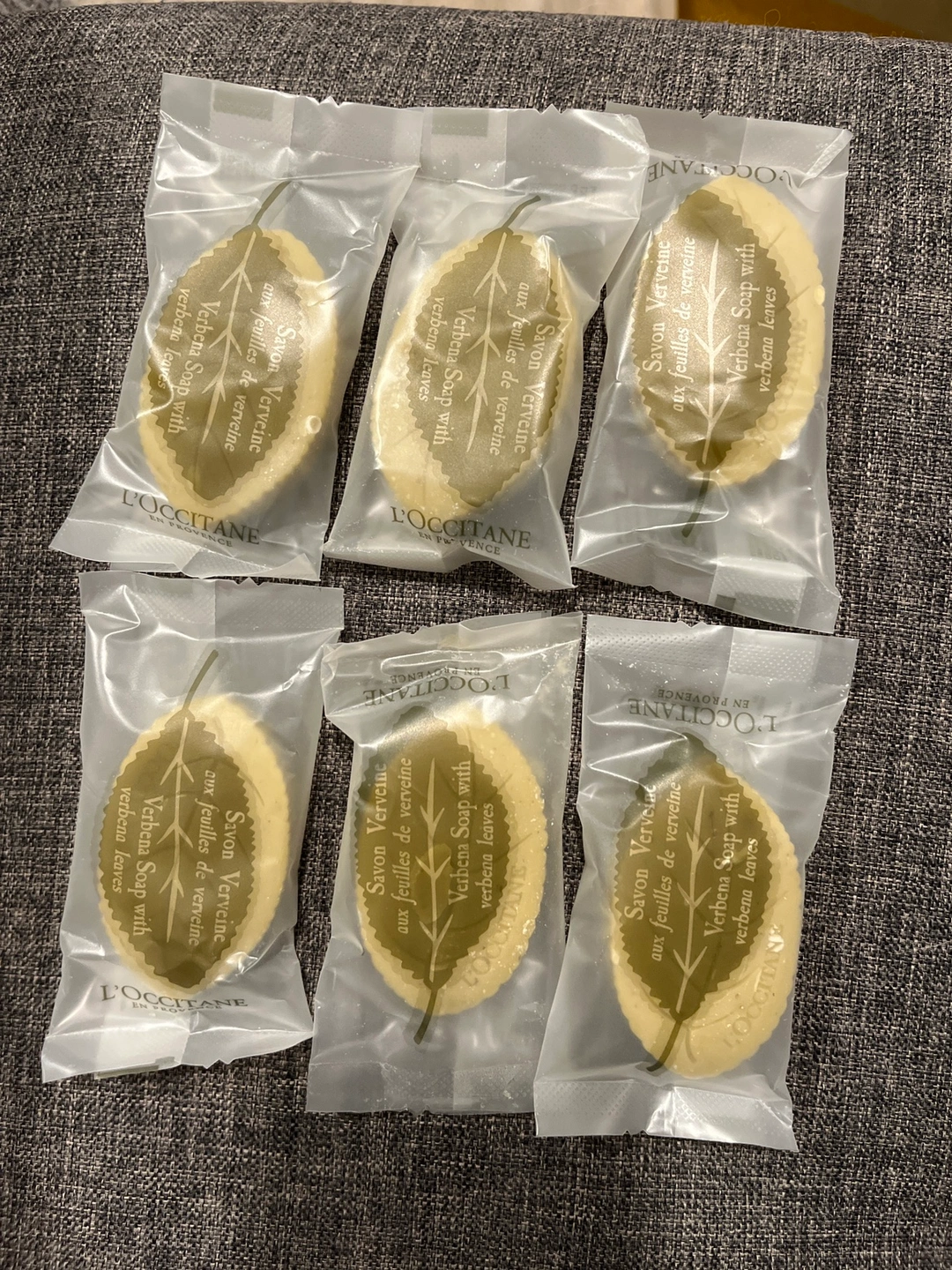 Six L'Occitane Verbena Soap Bars in individual packaging.
