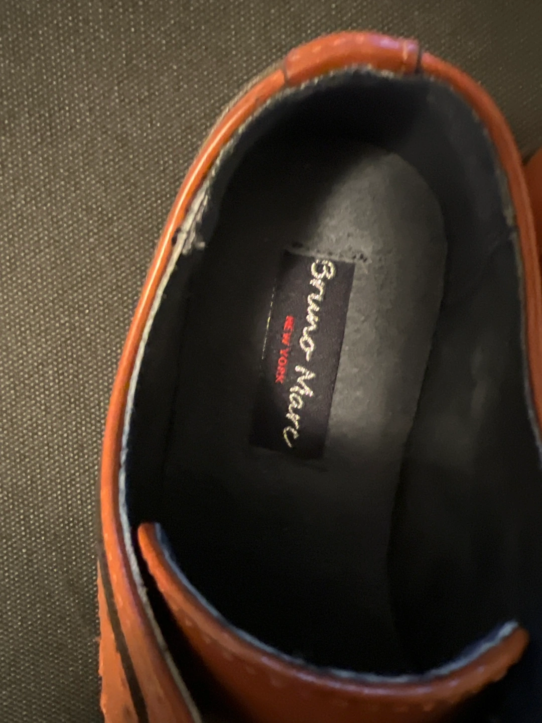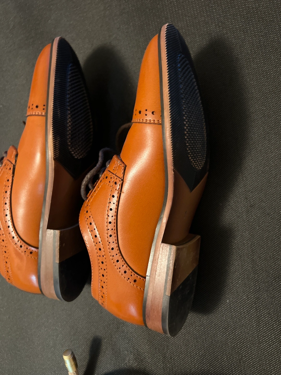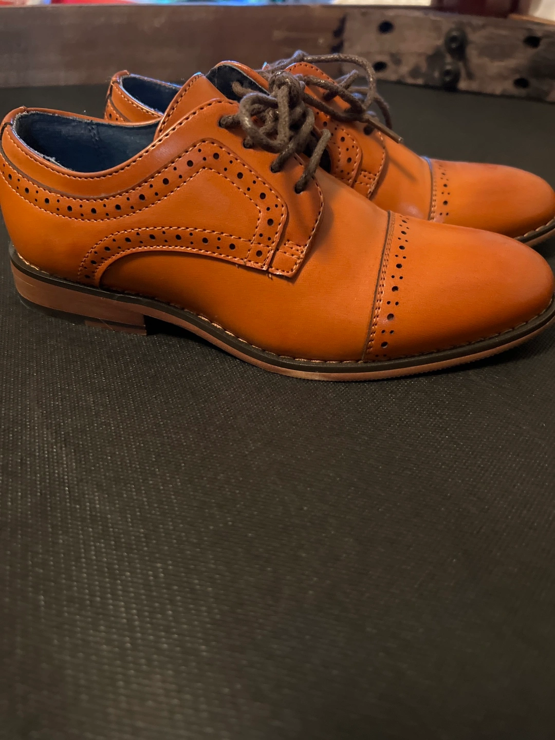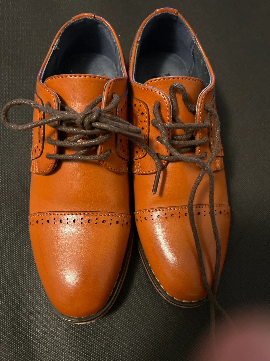 These are a pair of boys' brown leather shoes. They have a lace-up closure and a perforated design.