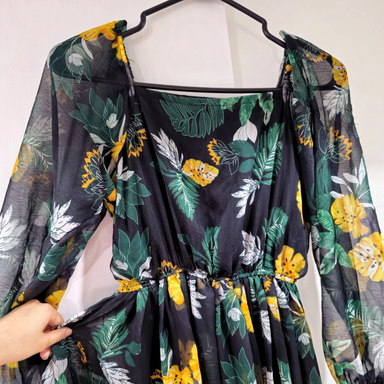 This stunning black maxi dress (inner attached) features vibrant tropical florals of green and yellow. The dress is made from a lightweight chiffon, sheer fabric with the length of 53 inches. With a modern square neckline (can be styled as off-shoulder as well), flowy lantern sleeves that are elasticized at the cuffs (can be effortlessly folded to create a 3/4 sleeve look), and a comfortable elasticized waistband that cinches at the natural waist, creating a flattering and relaxed silhouette. This dress is super VOLUMINOUS (as you can see in the 3rd picture), making it perfect for vacations and special occasions.
