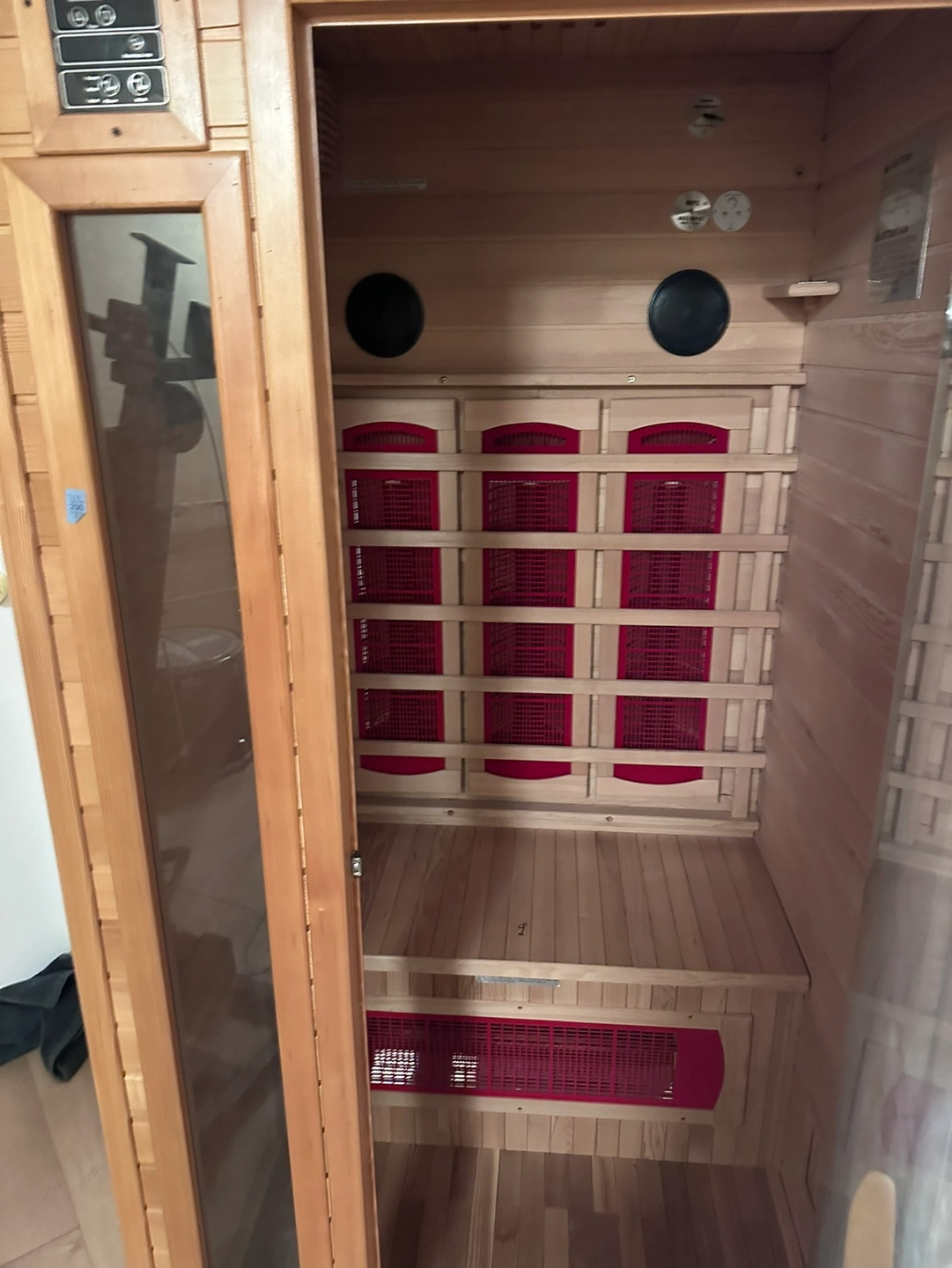 This infrared sauna has a digital control panel, a built in speaker, and a glass door. It has two benches. There are infrared heating elements on the back wall. There is an integrated timer.