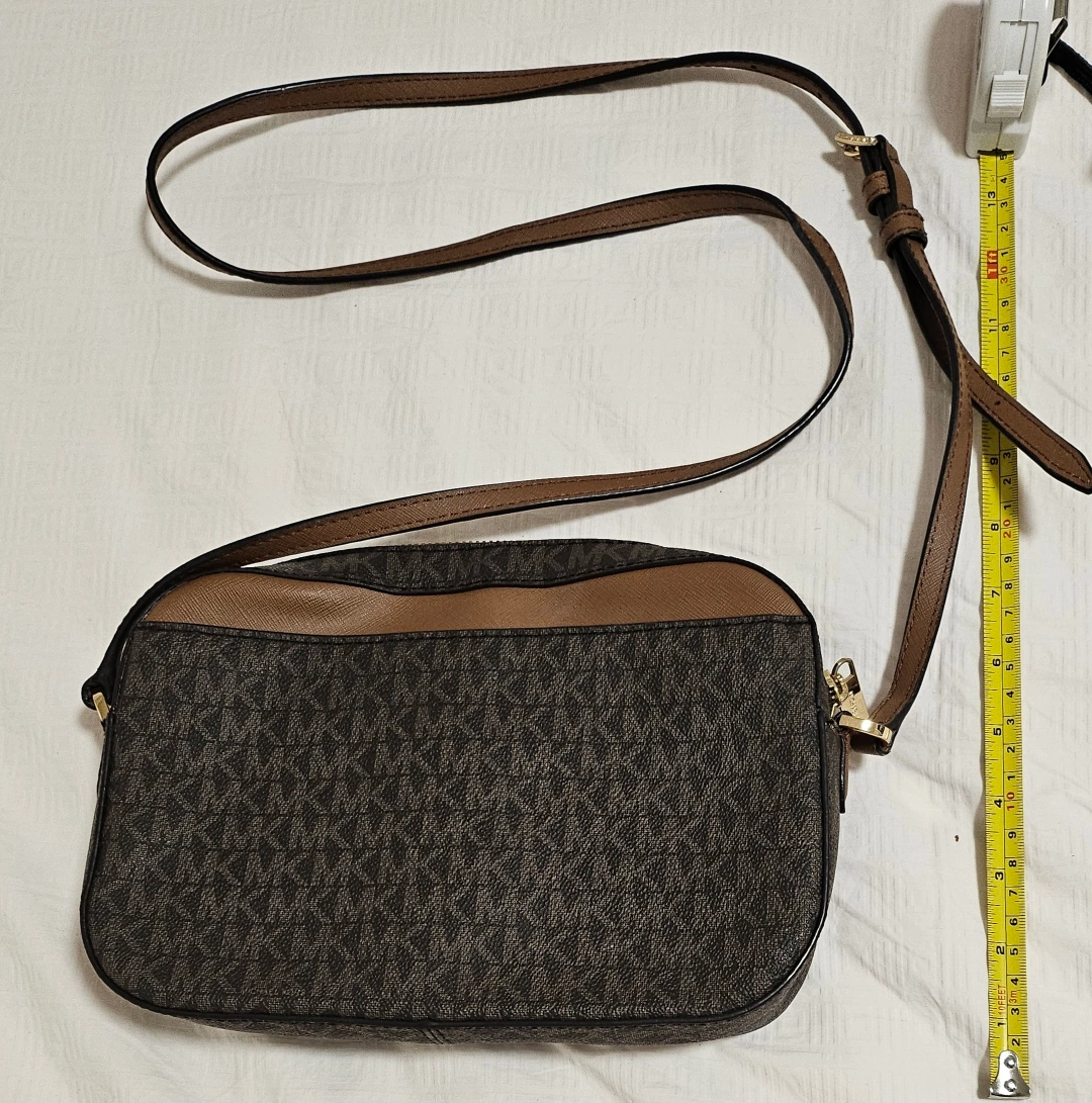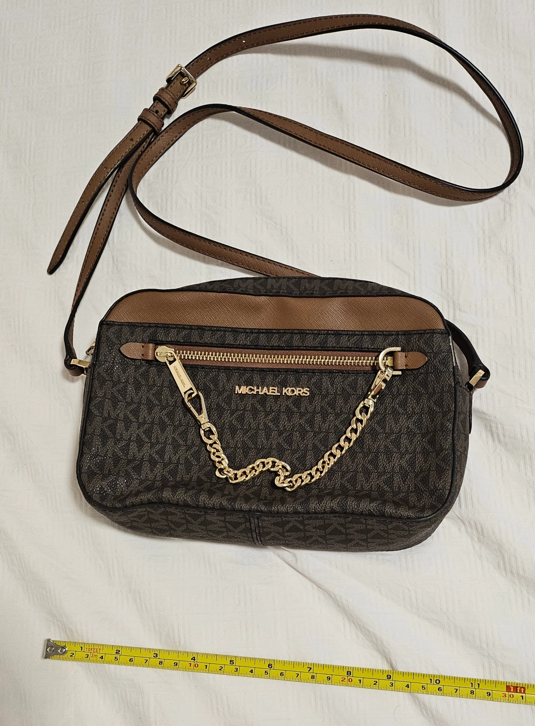 A Michael Kors crossbody bag with a brown signature pattern. The bag has a gold chain strap and a gold zipper. The bag has a brown trim and is a great size for everyday use.