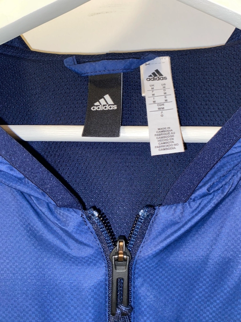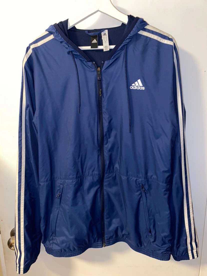 Size Medium Navy Blue jacket with white stripes down the sleeves. Zipper pockets with working zippers. Breathable rain-proof material.