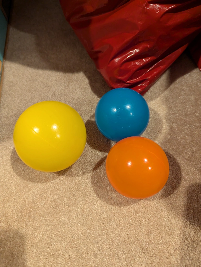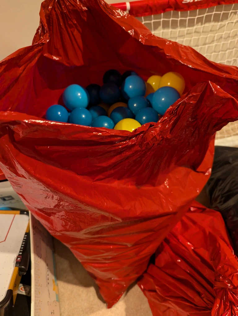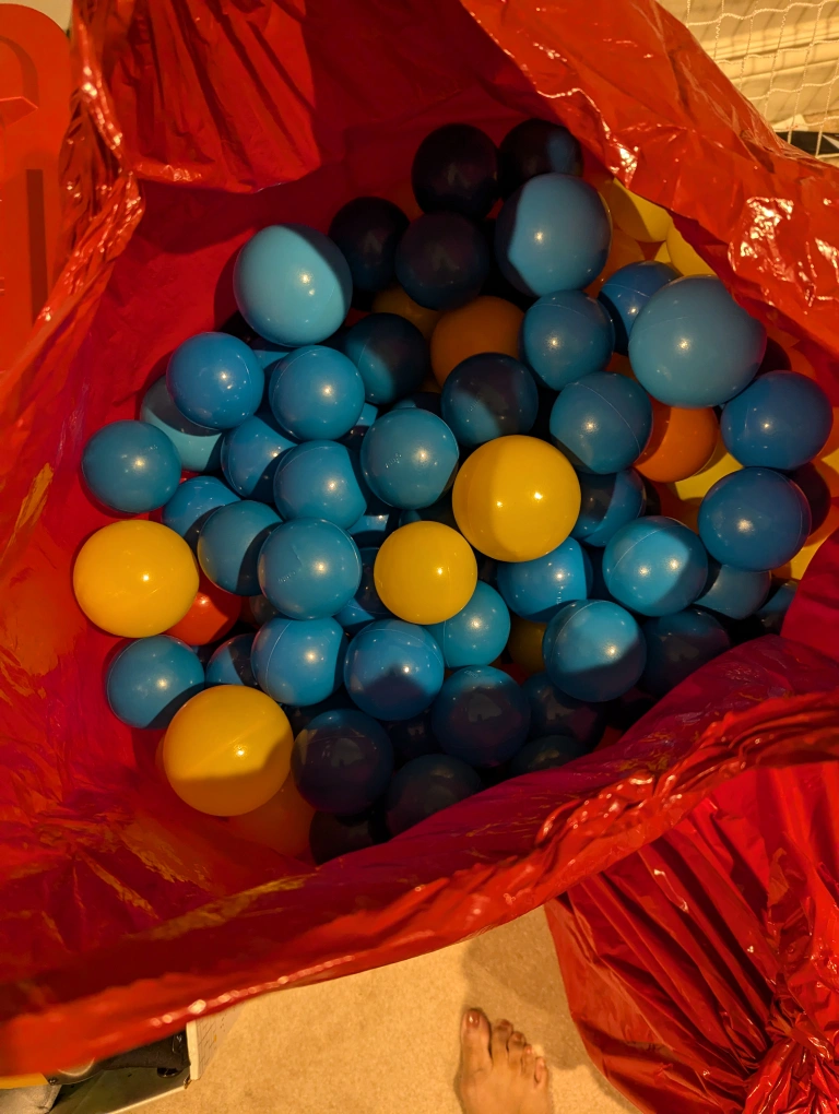 A large bag of ball pit balls in blue, yellow, green, red and orange. Two different sizes. Picture shows one giant bag, but there are 2.5 bags . I haven't counted them but there are at least over 100, which is perfect if you want to create a ball pit for your little one. Contactless pickup : near John Street and Bayview Avenue (Markham West)