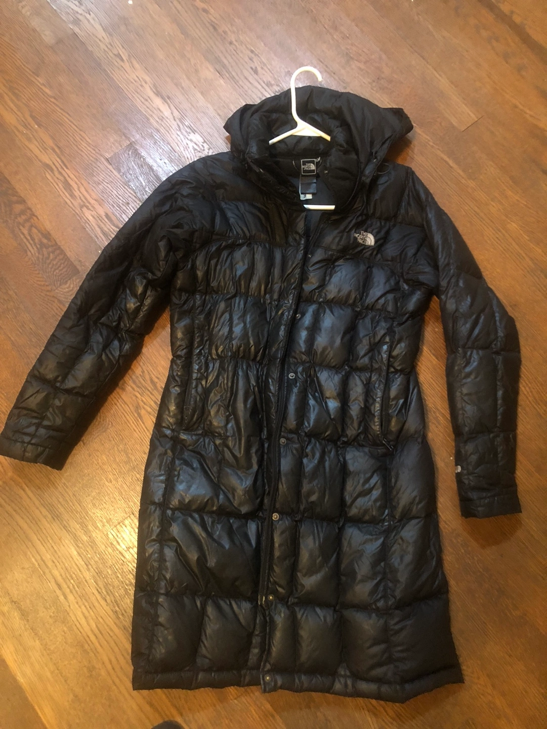 Women's black puffer jacket with a hood. It has a zipper closure and snap buttons. There is a logo patch on the left arm. The jacket is in good condition. It is a great choice for a cold winter day. I wore it for a few seasons and am ready to pass it along.