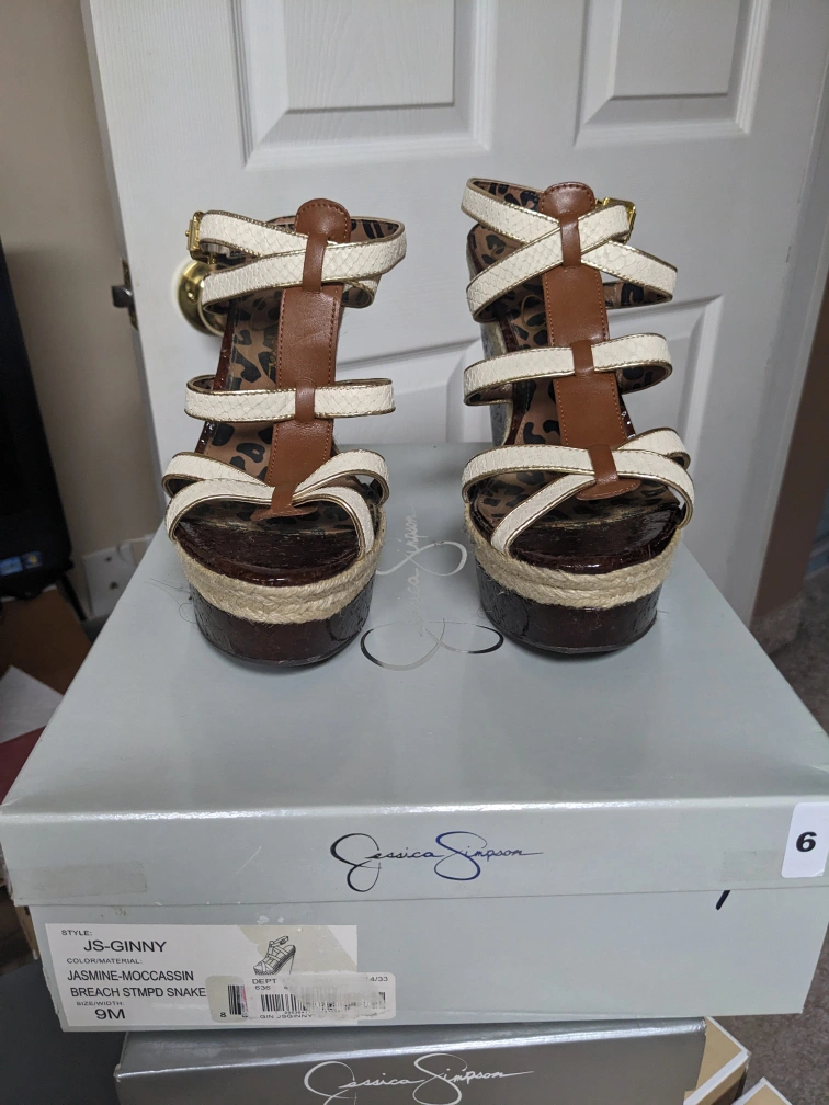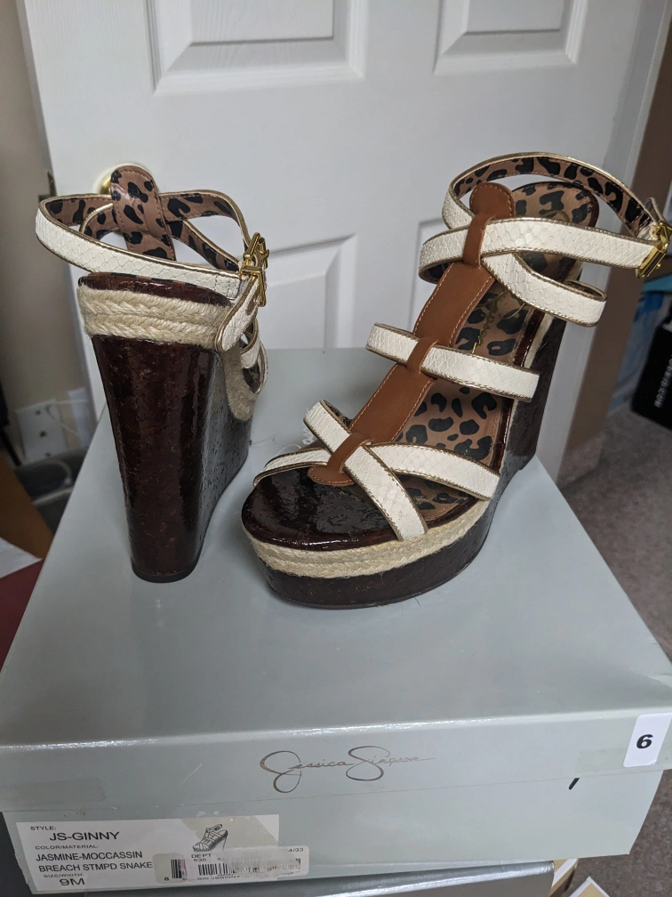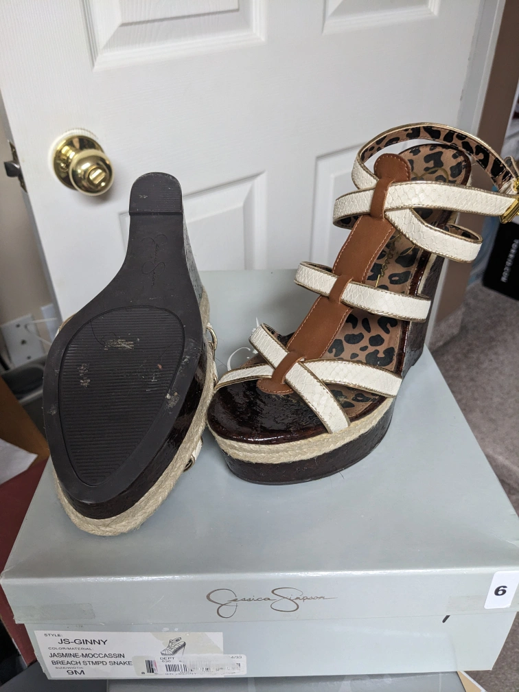 Women's size 9, brown, white and gold wedge sandals with straps and buckles.