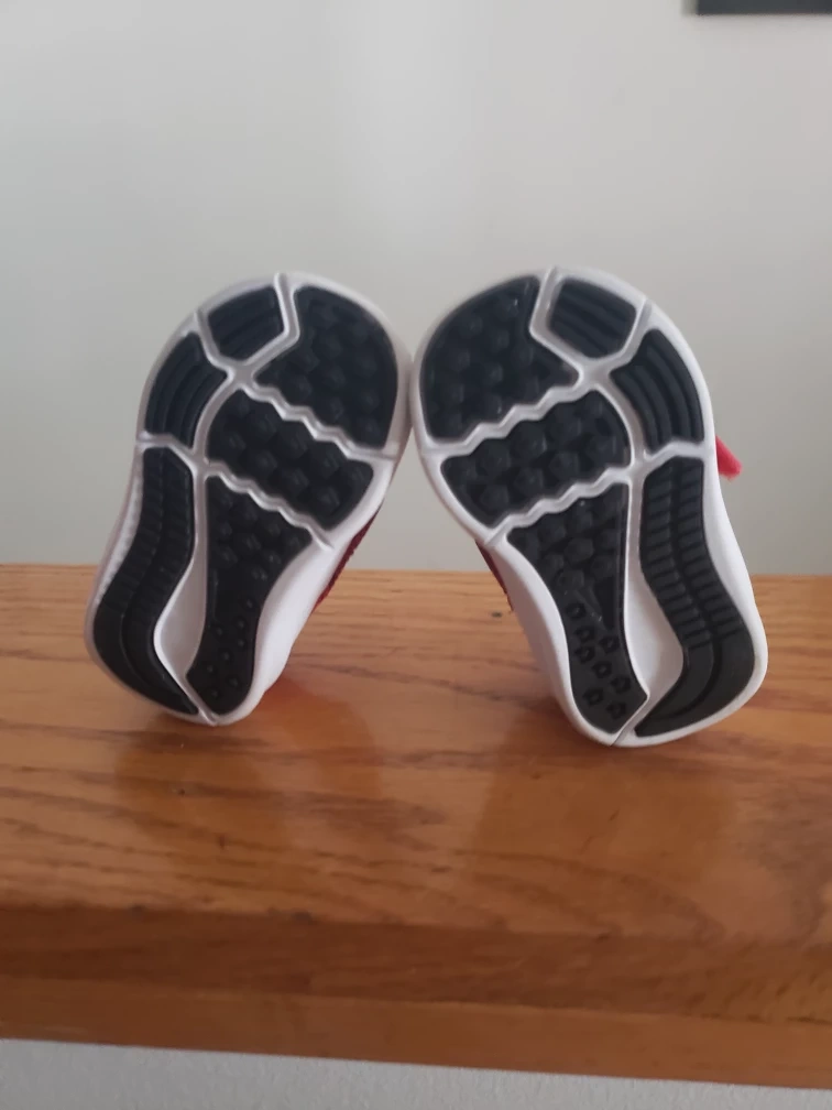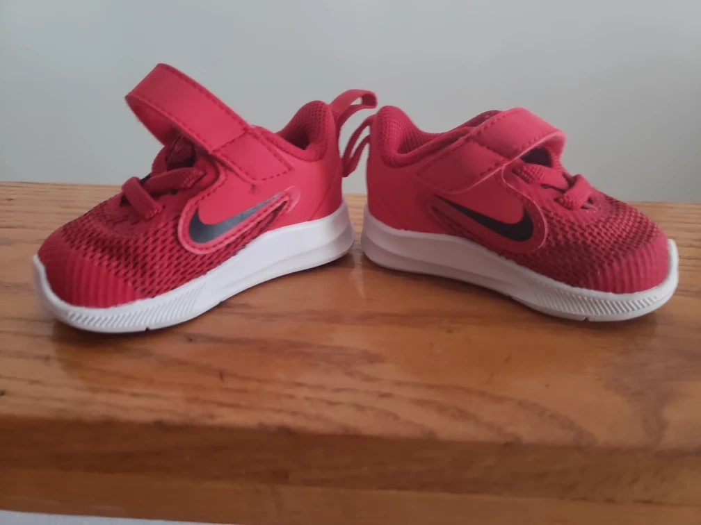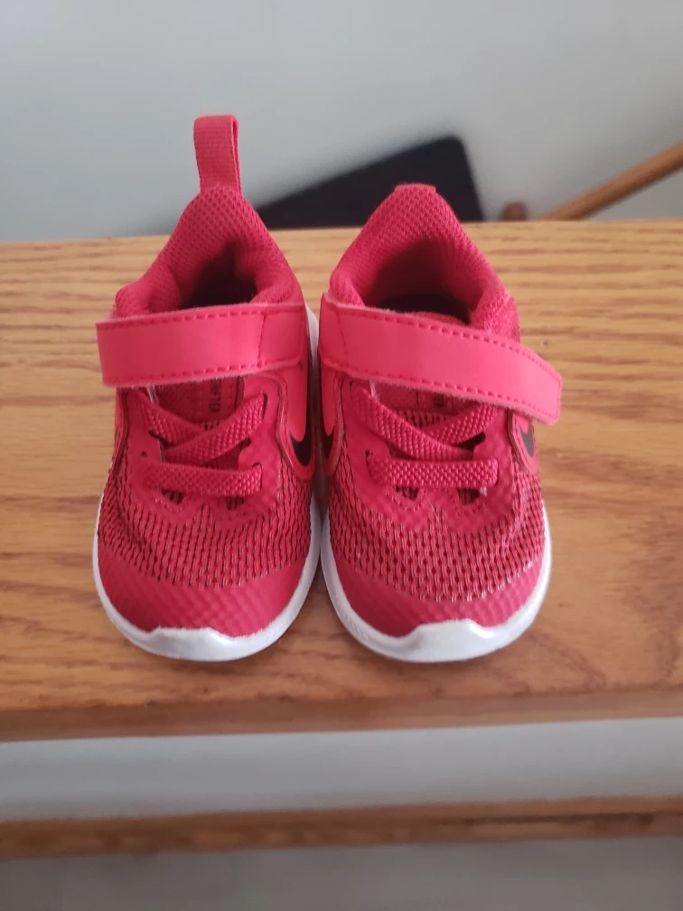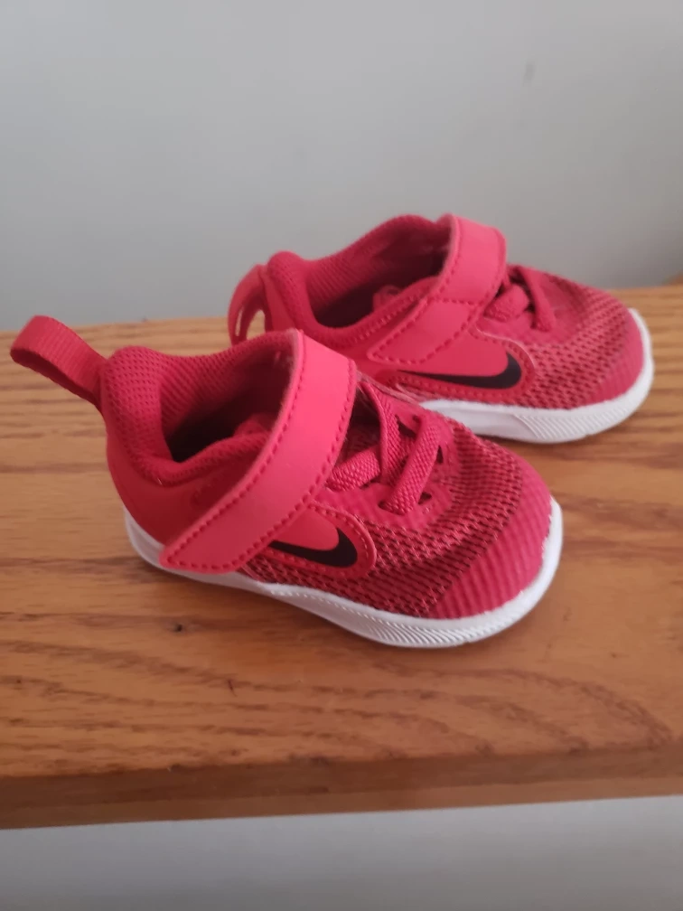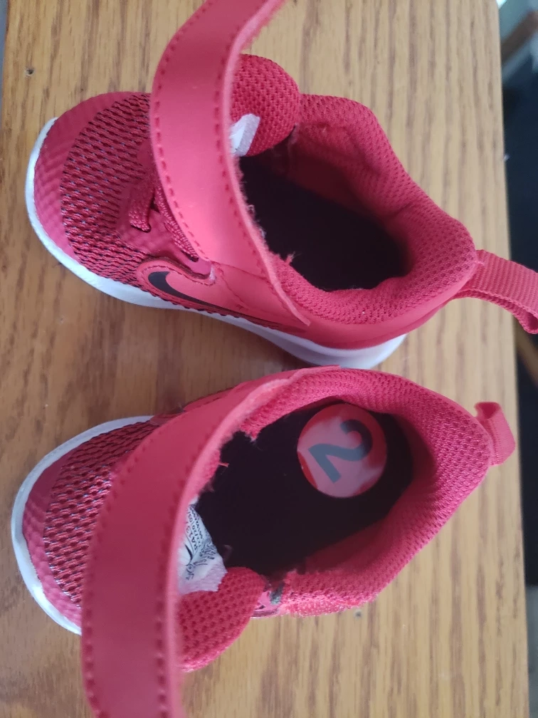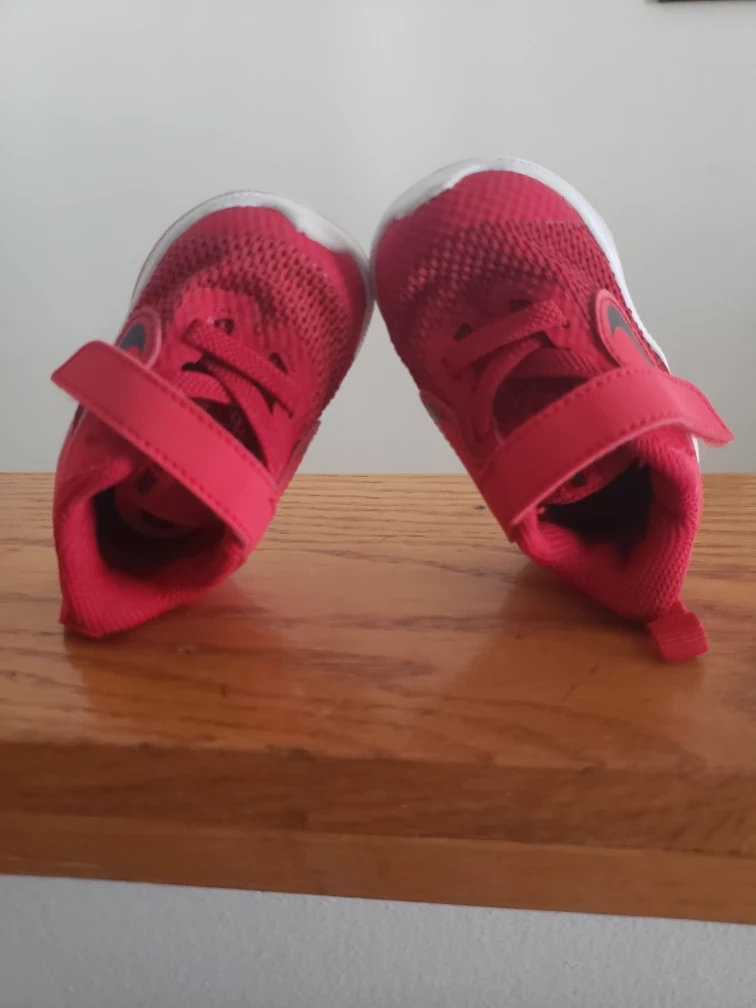 Red Nike baby shoes with velcro and laces. Size 2. NEVER WORN