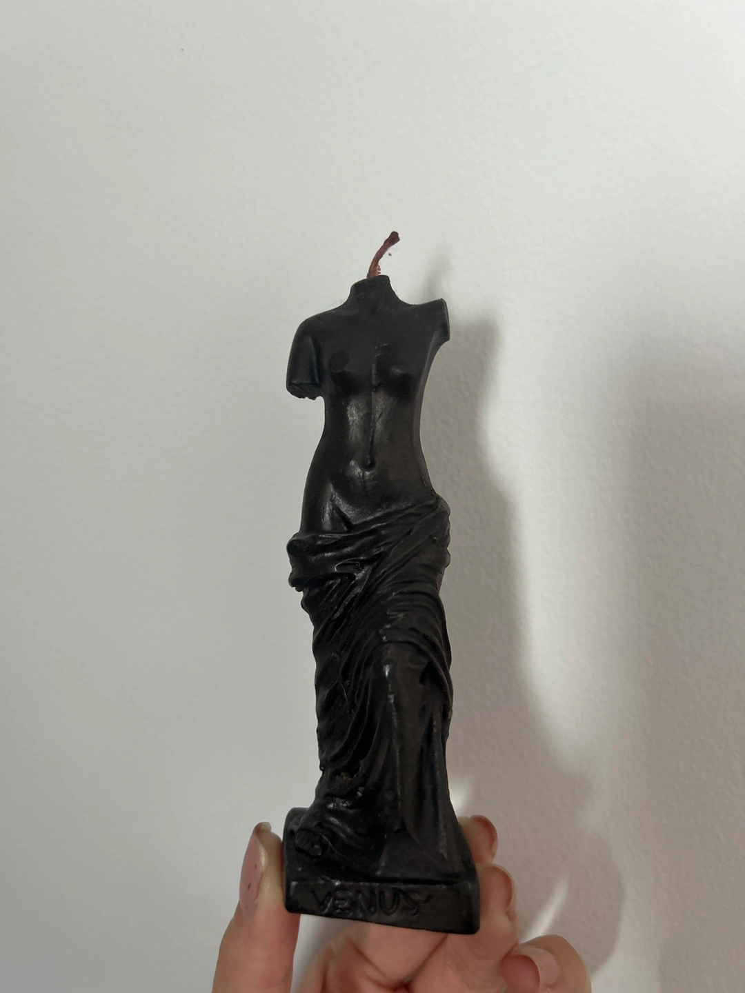 Black candle shaped like the Venus de Milo statue. A decorative piece for your home.
