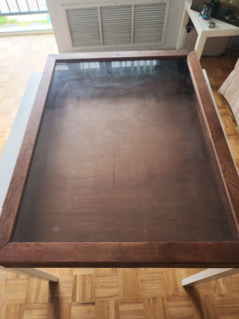 A wooden display case with a glass top. The case is hinged and can be opened. It is great for displaying collectibles. Moving in June, everything must go, make an offer !