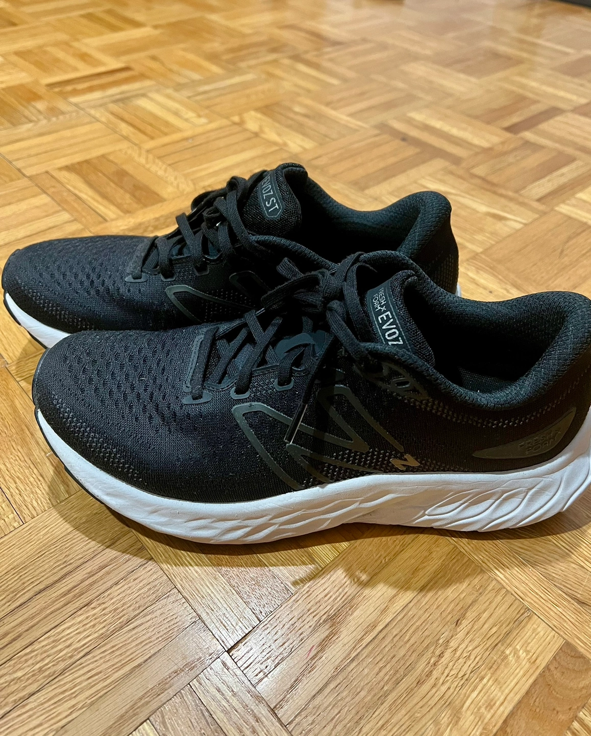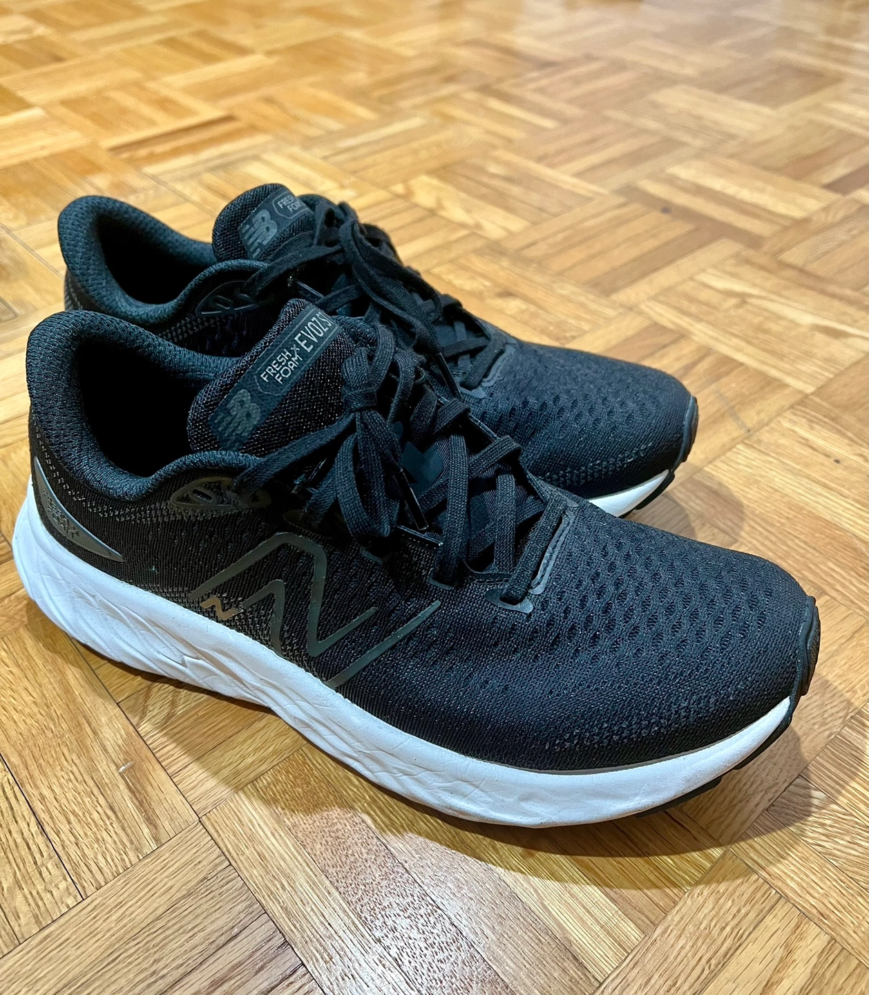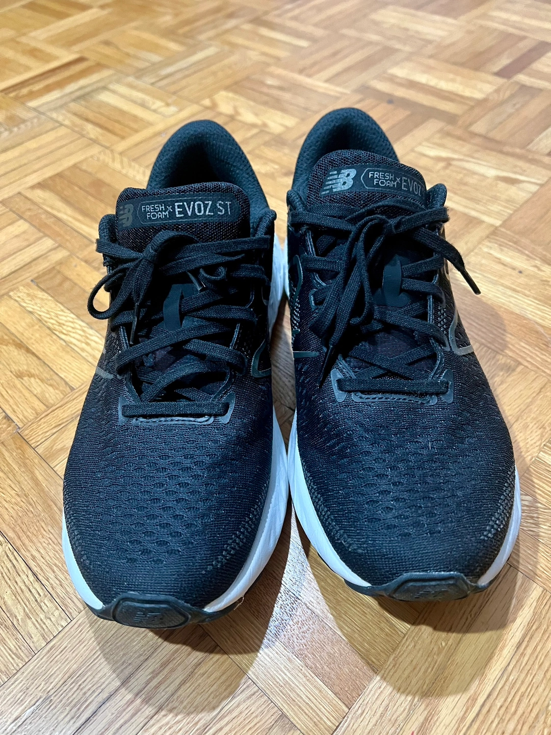 Black running shoes with white soles.