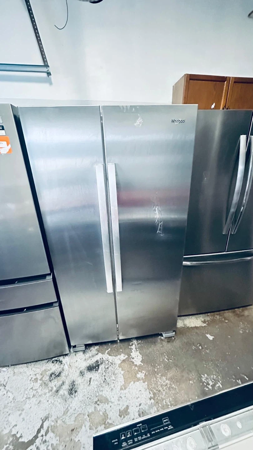 Whirlpool French door refrigerator in a brushed stainless steel finish. This fridge has side-by-side doors and sleek silver handles. It's a spacious appliance for any kitchen.