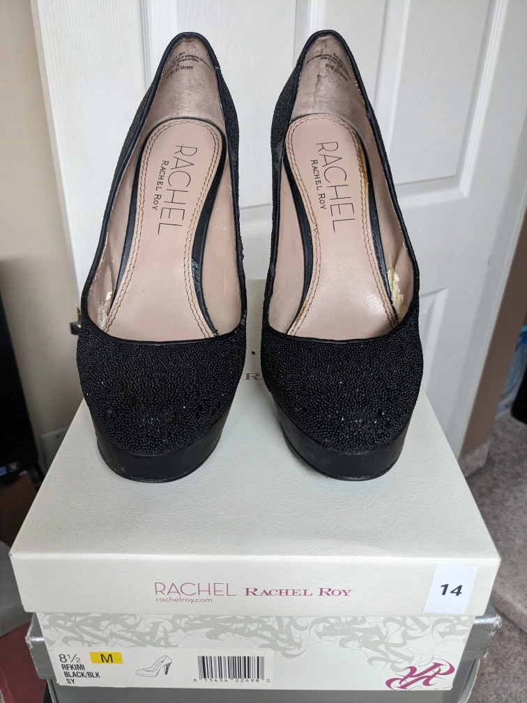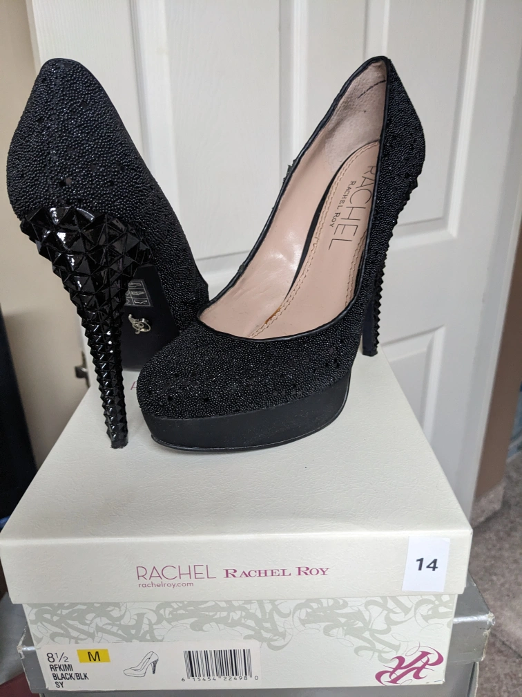These are black platform heels in size 8.5 by Rachel Roy. They have a unique design with a studded heel. They are in excellent condition.