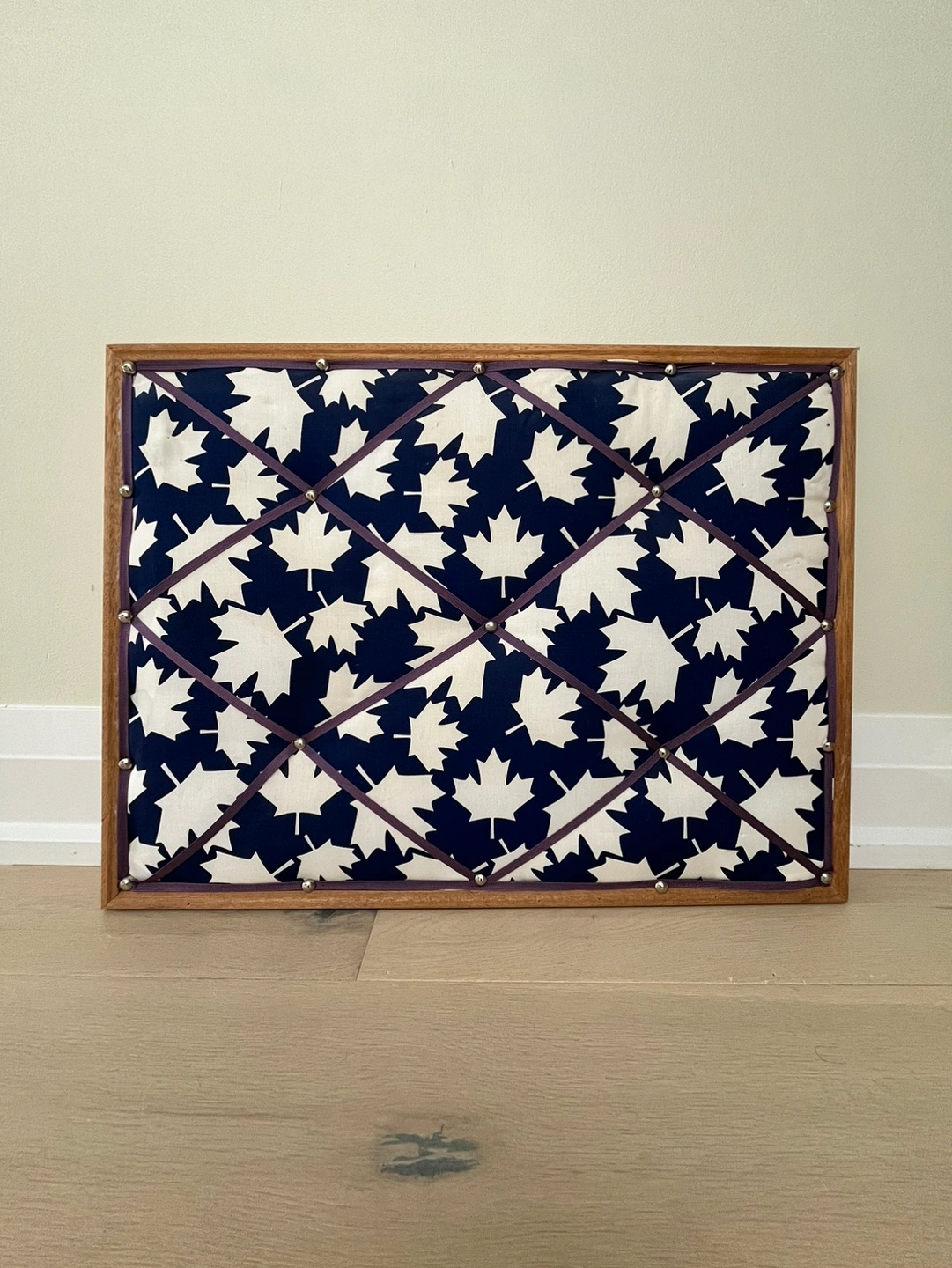 A wooden framed pin board with a fabric featuring a pattern of white maple leaves on a dark blue background. It features a criss-cross pattern of dark brown ribbon and has a series of silver tacks that help hold photos or documents without using push pins. Perfect or an office, kitchen or bedroom to stay organized! Measures 18β x 24β.