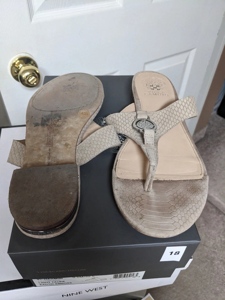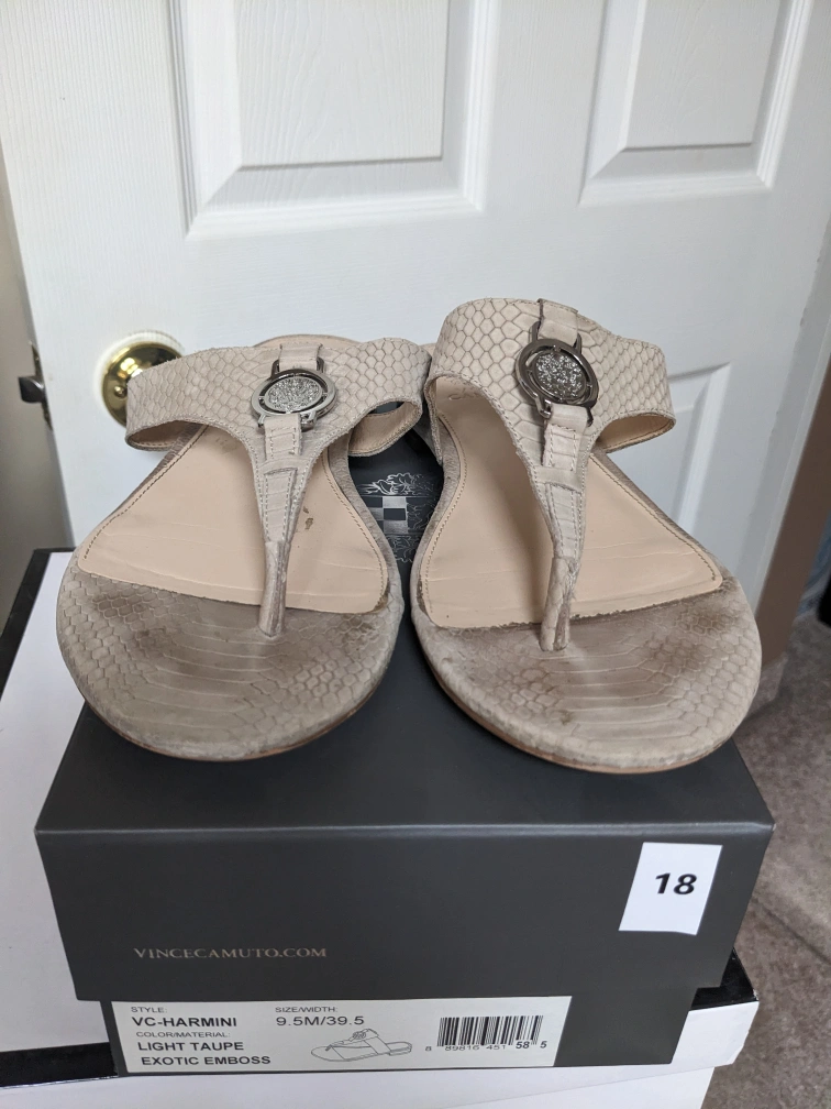 These are a pair of women's sandals by Vince Camuto. They are a light taupe colour with a snakeskin pattern, featuring silver Vince Camuto buckle. They are size 9.5 They come with the original box.