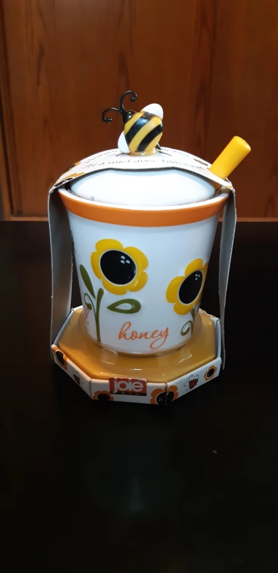 828Brand new! Ceramic honeypot with bee decoration on lid Perfect for storing and serving honey Includes plastic dipper Pot and dipper are dishwasher safe BPA free