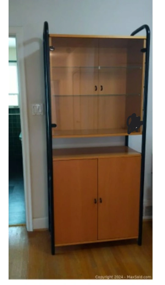 This cabinet has glass doors on the top half and wood doors on the bottom half. It has adjustable shelves.