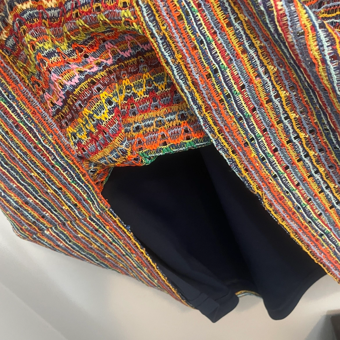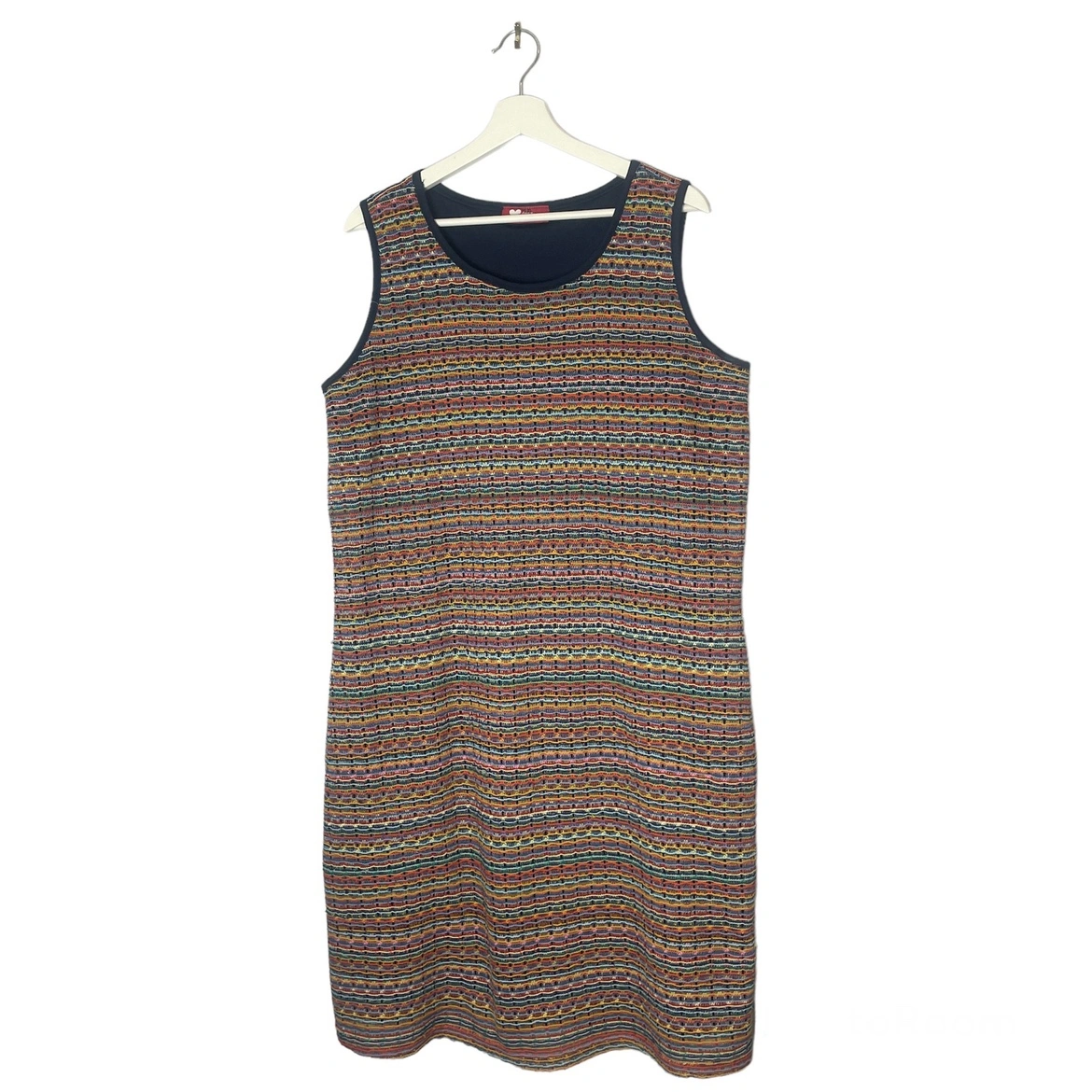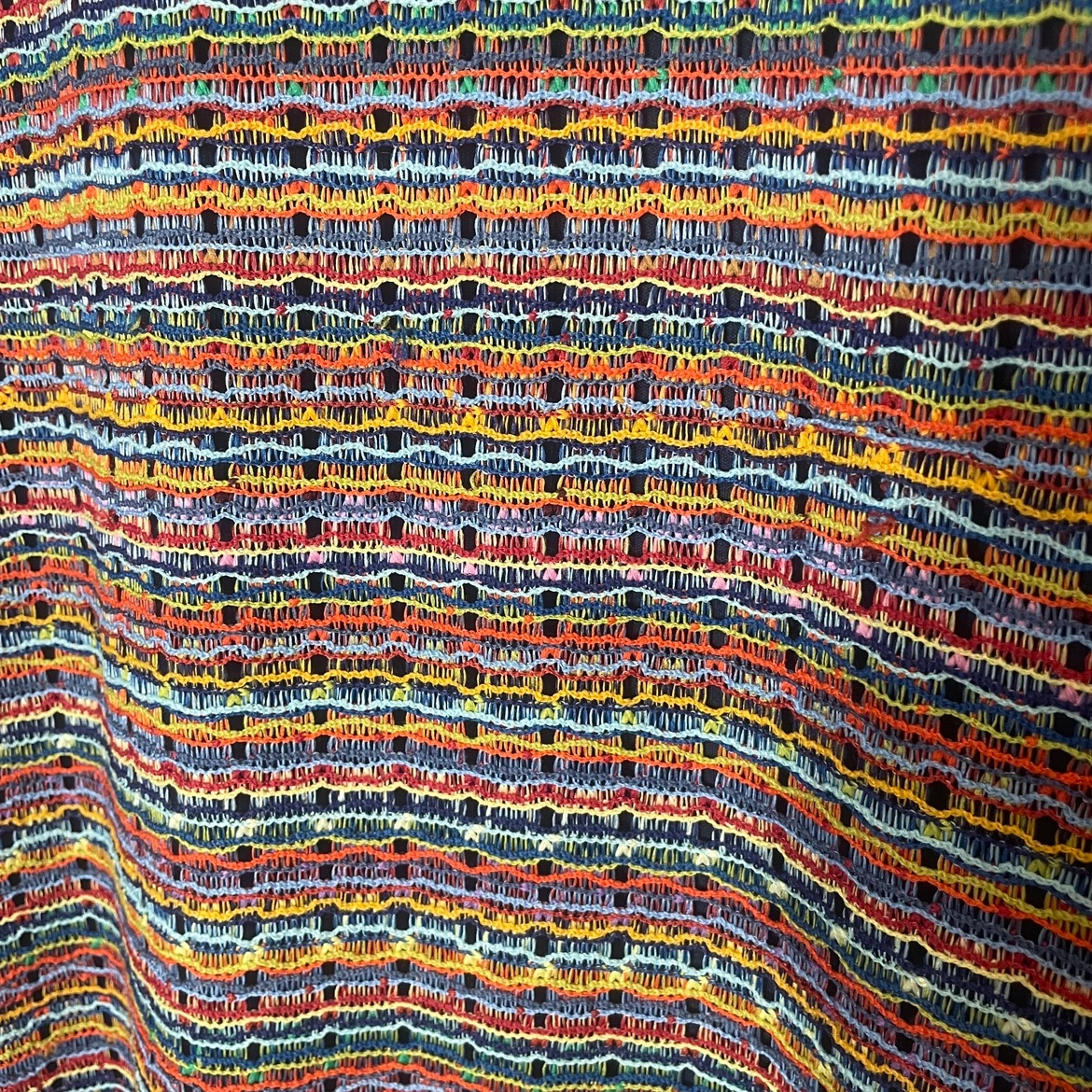 Un Deux Trois Crochet Knit Shift Dress Size XL Excellent worn condition Fully lined in navy. Beautiful crochet colour pattern. Similar to Missoni style or 80s Length: 41" approx Pit to pit, front: 22" approx More measurements available upon request. Styles: colorful rainbow