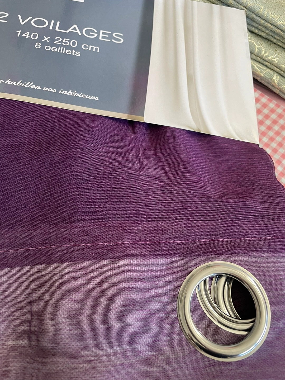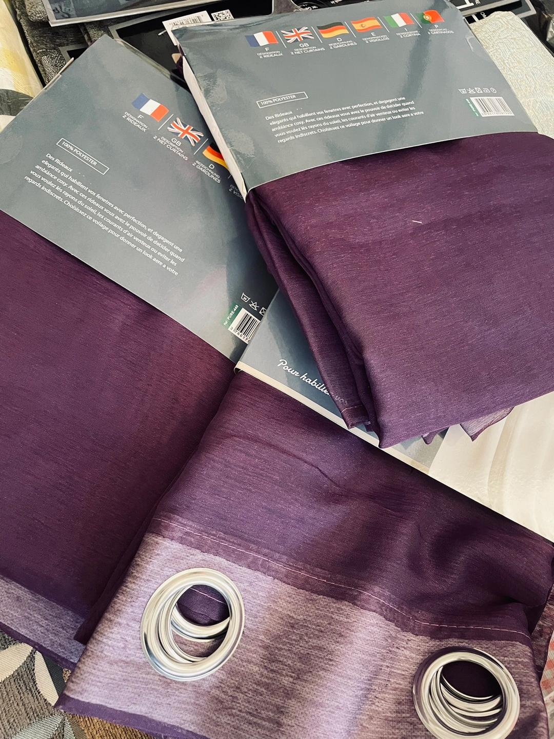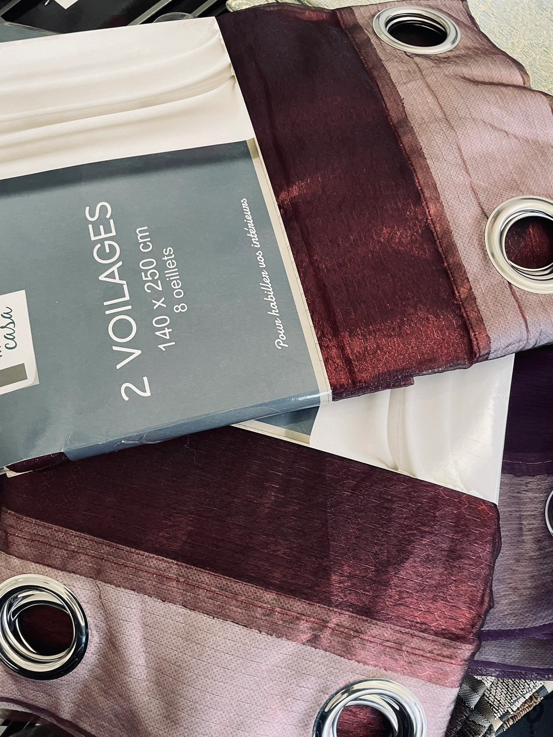 Purple and Burgundy , brownies curtains with grommets. Package includes two curtains. Size is 140 x 250 cm. They are made for a standard rod.