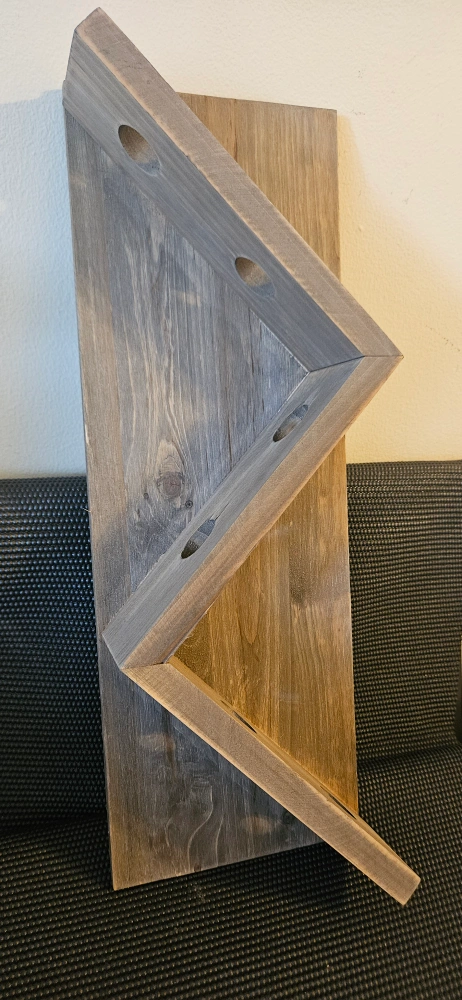 This is a wooden wine rack with six bottle holders and a rustic finish. It is perfect for displaying your favourite bottles of wine.