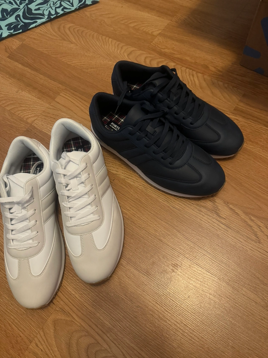 2 Pair of Sneakers. One pair is white with white laces and the other pair is navy blue with navy blue laces. Size 12.