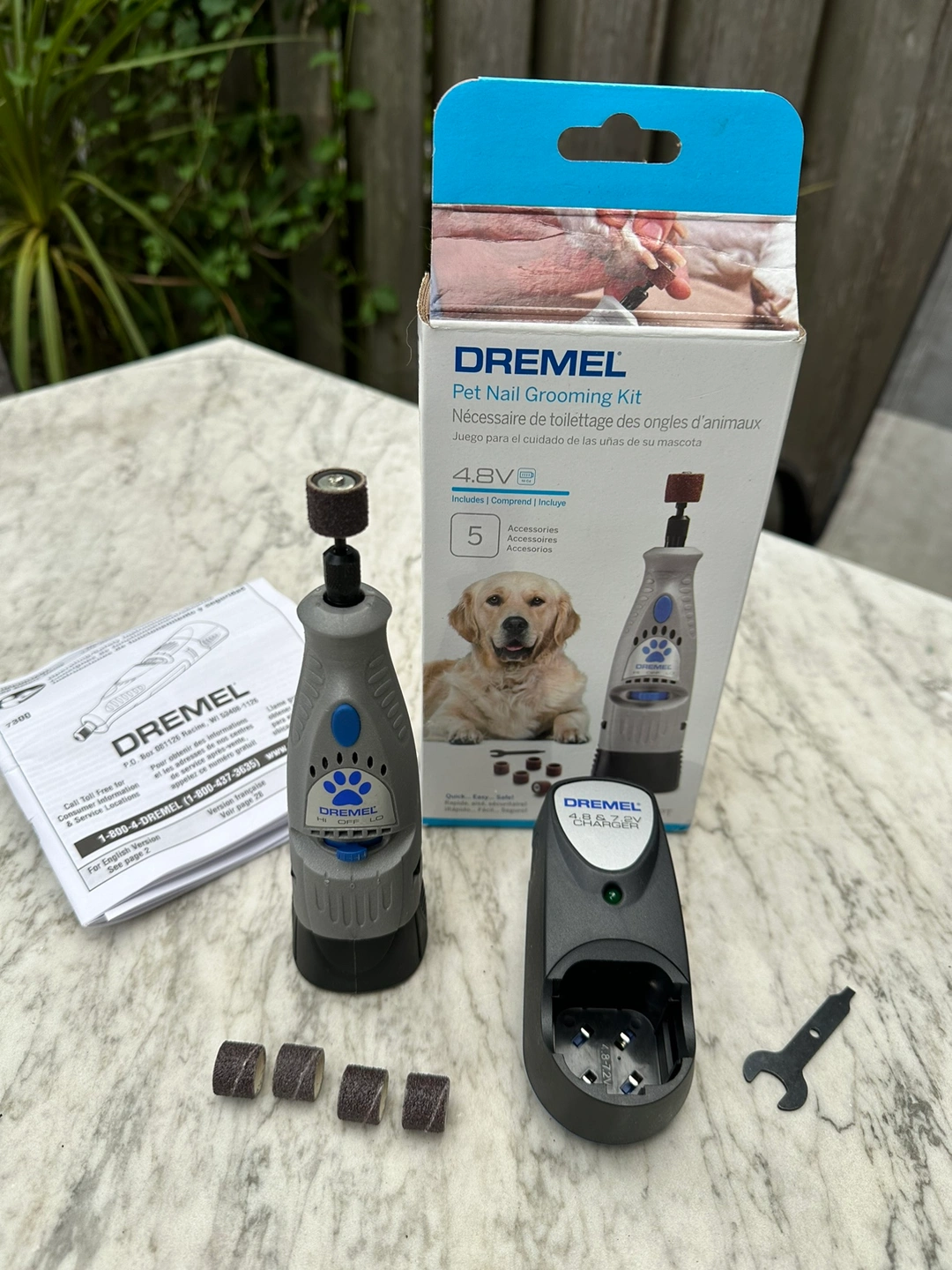 114Brand new Dremel pet nail filer with all brand new extra files. Perfect for pups who are too scared of clippers!! Never used (my dog lets me clip his nails now!). Comes with all original packaging & pieces as in the pictures.