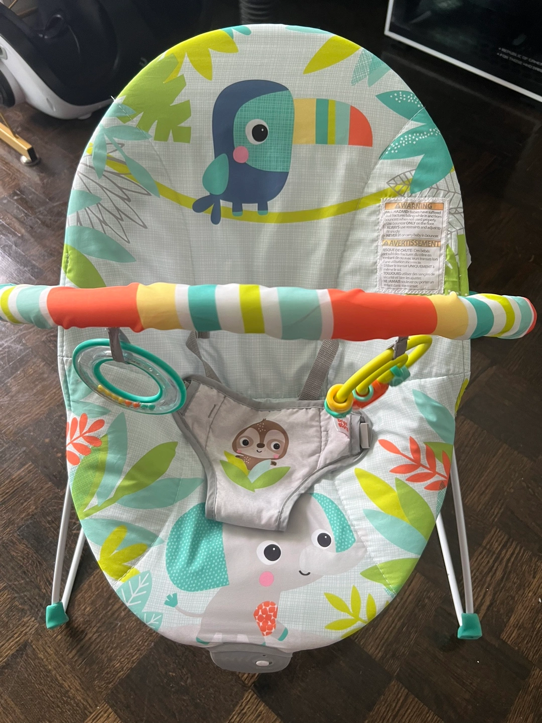 For sale a baby bouncer with a jungle animal theme. It has a green, blue, orange and grey colour scheme. The bouncer has a toy bar and comes with a removable headrest. You can put battery on it for music. It has been washed already. My baby has outgrown it that’s why im selling it. For pick up and cash only
