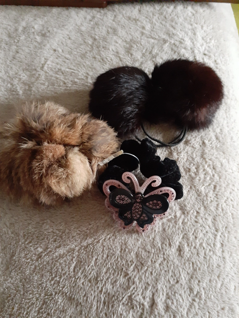 Three hair accessories: one faux fur pom-poms, fur scrunchie and one butterfly-shaped hair clip.
