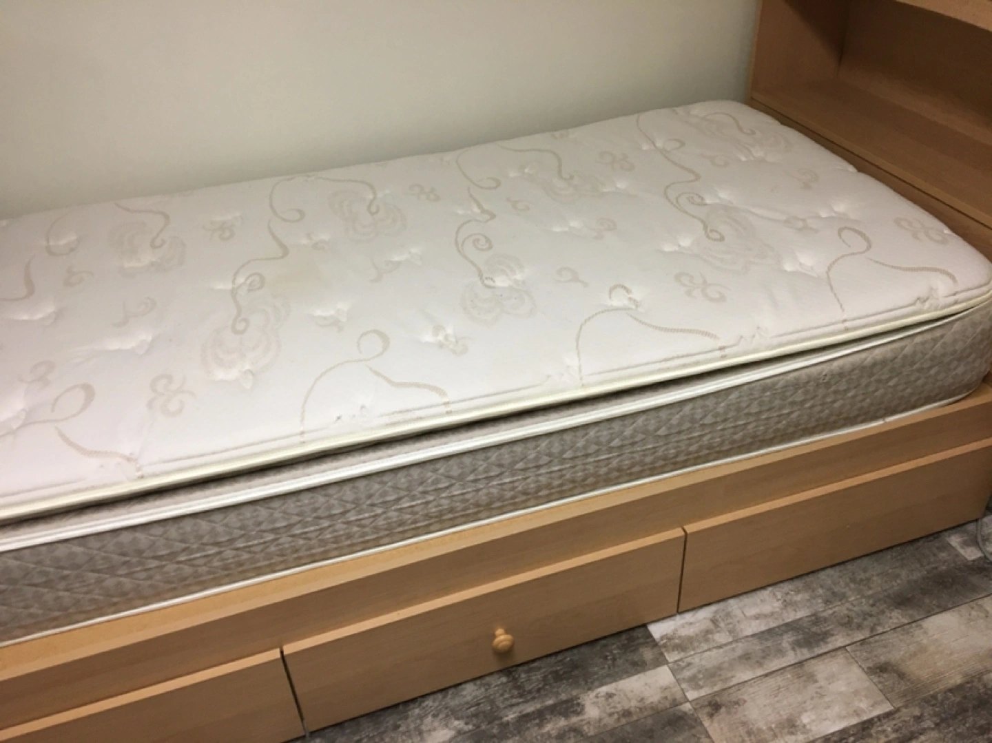- LIGHTWOOD TWIN BEDSET WITH 3 DRAWERS, MATTRESS INCLUDED AND IN TOP CONDITION, dimensions: length 76 In, width 42 In