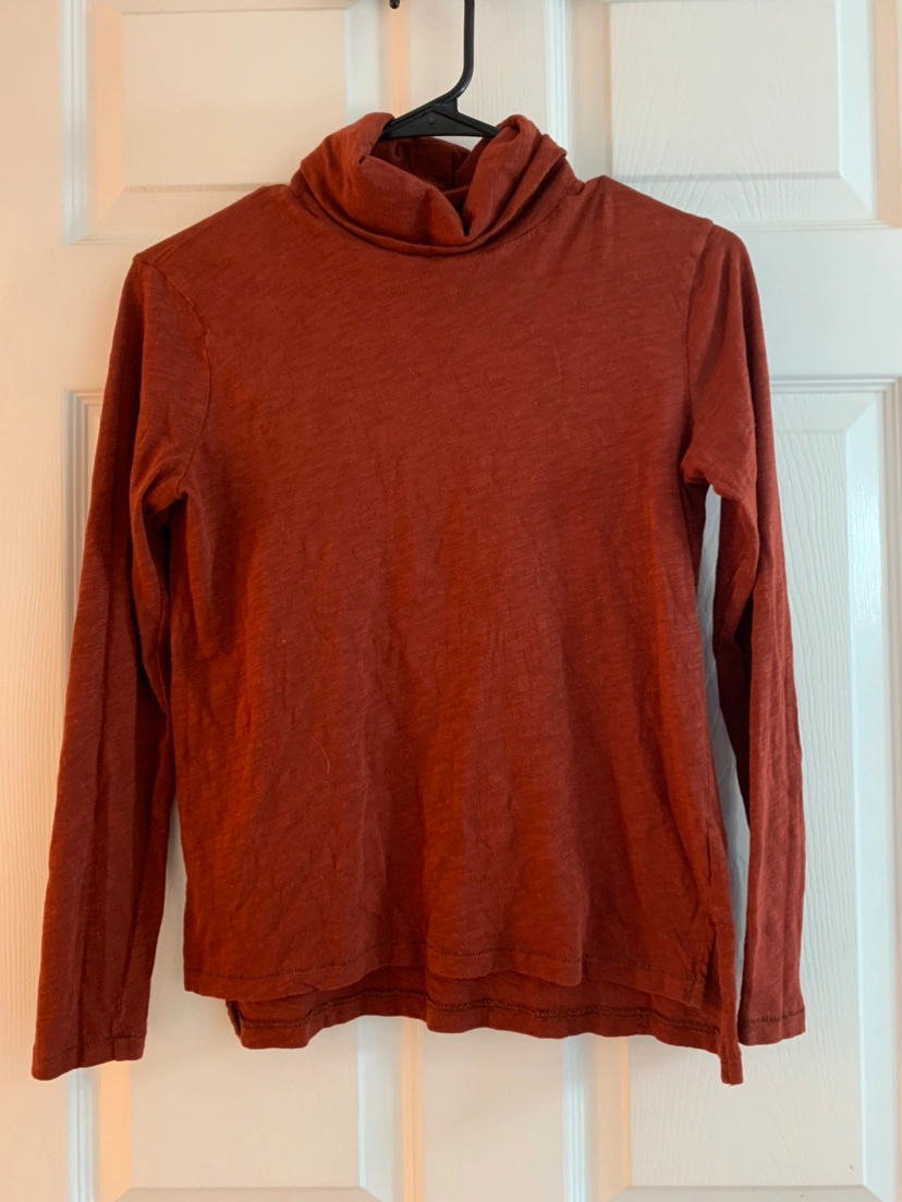 Rust-colored long-sleeved turtleneck with a relaxed fit. Light fabric and good for layering. XS but runs big.
