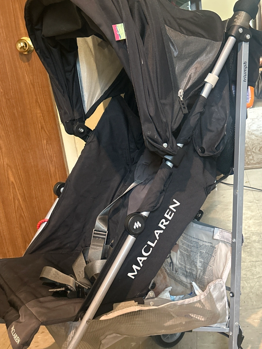 Stroller with black frame and gray accents. It has a black mesh and gray material bag.