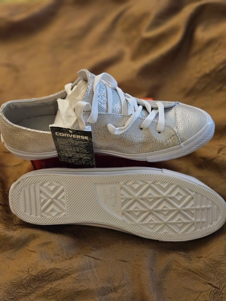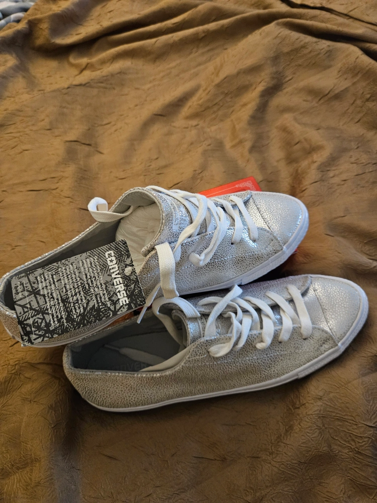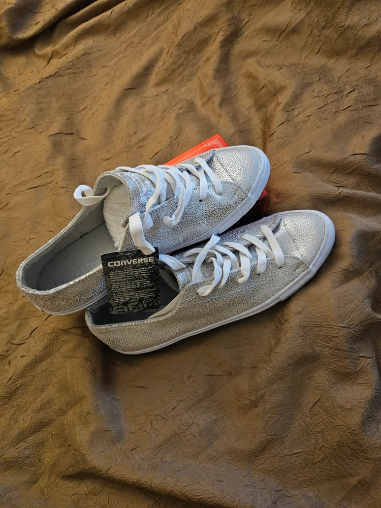 Women's Converse sneakers with a silver leather upper. The shoes have white laces and a white sole. The shoes are in new condition, with tags still attached.