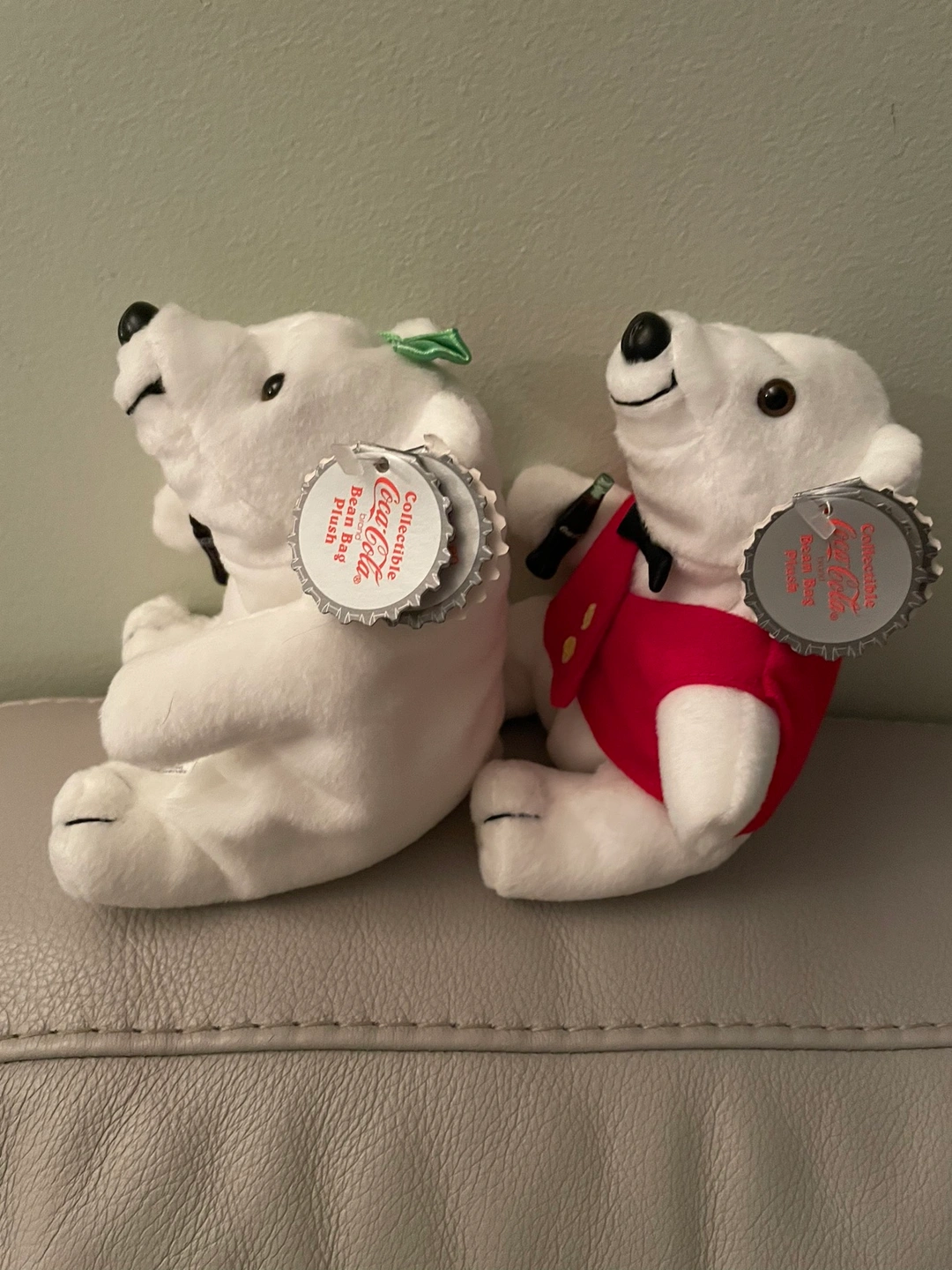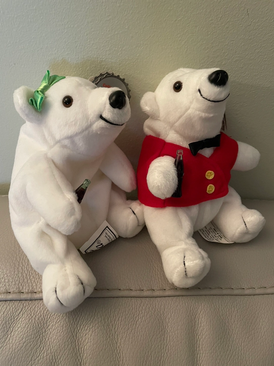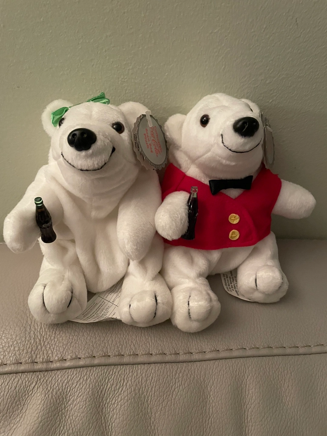 Pair of his and hers polar bears with their own Coca-cola bottles